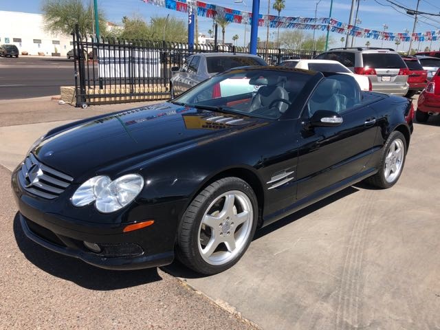Fully loaded, garage-kept Arizona AMG Sport SL500 roadster in good overall condition. This roadster is finished in Black exterior with Black premium leather interior and is powered by a 302hp 5.0-liter V8 engine with a 7-speed automatic transmission. It comes equipped with panoramic top and factory luxury options, including dual climate-control air conditioning, power windows, locks and mirrors, DVD navigation, premium BOSE sound system with CD-changer and multi-contour power seats. A well-maintained and serviced vehicle with a clean CARFAX history.