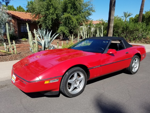 1989 Corvette Convertible - Since its introduction in 1984 the C4 is equipped with a 350CI 240/245 Horsepower, Tuned-Port Fuel Injected L98 V8 Engine. In 89, they added the ZF six speed transmission for massive improvement. Another significant change for 1989 involved standardizing the Z52 package. While the Z52 option had been optional in previous years replaced the smaller, sixteen inch wheels which had been used on the C4 Corvette since 1984. Additionally, all models now included fast-ratio steering, Delco/Bilstein gas-charged shocks, and a fortified front end structure. For cars that were equipped with the new six-speed manual transmission, Chevrolet standardized the heavy-duty engine oil cooler, the heavy-duty radiator and the auxiliary radiator fan. This 1989 Convertible is a California and Arizona car and comes with a clean CARFAX report.