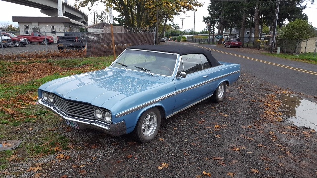 64 Buick Skylark Convertible, 310 Wildcat V8, Automatic Transmission, Power Steering, Power Top, Dual Exhaust. Restored about 6 years ago in original Wedgewood Blue paint. Black interior with new black cloth top. Period correct mag wheels with newer BF Goodrich Radial T/A’s. This car is super dependable and drives great – cruises the freeway at 75mph real easy. Updated stereo CD player with bluetooth.