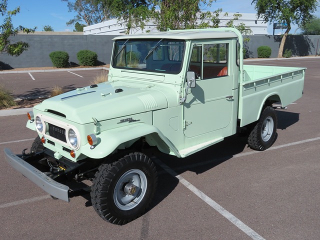 Most people who fell in love with the Land Cruiser fell in love with a J4. After achieving an international reputation with the J2/J3, Toyota embarked on a redesign process that resulted in an iconic and memorable look that would define Land Cruiser for the next two decades. Initially, the J4 simply offered a slightly different wheelbase than the previous production model. By the end of the production run, the J4 models boasted four different wheelbase lengths. The "long" and "extra long" wheelbase trucks have grown to become some of the most desirable vintage Toyotas of the generation. This FJ45 long wheelbase has undergone extensive restoration work and is shown in Spring Green over gorgeous Coral interior. It features the optional "headache rack" and still retains it's factory tool kit! This 1965 Land Cruiser was purchased out of Eastern Washington state by the owner who went on to restore the truck. Extra attention was devoted to making sure every nut and bolt was removed and replaced with correct hardware for the time period. Well maintained and cosmetically refreshed this FJ45 is the nicest examples on the market and will draw stares and conversation anywhere you adventure to. Don't miss a rare opportunity to own the best. The body on this FJ was in very nice condition prior to the repaint. The truck came out of the eastern Washington desert and showed very minimal signs of corrosion. During the repaint bed was removed, chassis painted and cleaned and then re-assembled. The paint on the truck is fully redone and finished in its original color of Spring Green. This truck was completely disassembled with all parts removed before paint. The truck was very straight and undamaged and required very little body work. The exterior trim and glass is in excellent shape! The suspension on this long wheelbase FJ45 was also gone through and completely redone at the time of paint. The Old Man Emu lift gives the truck a little more aggressive look while still maintaining an original feel. Both front manual- locking Warn hubs are in great shape and function correctly as they should. The exterior trim and glass is in excellent shape! All 4 split-rim wheels have also been gone through and refinished. They are wrapped in period appropriate 7.00-15 LT tires. Inside this old Land Cruiser is like a trip to the past. Everything is in working condition and looks as it should from near new! The beautiful Coral seats are a great contrasting color with the Spring Green exterior and really set the whole interior off. All handles, latches and assemblies have been replaced or refinished to keep everything crisp and new in the cab. The heater unit has been gone through and is also fully functional. Recently the truck also received a fresh headliner. All gauges and controls work in the cab as well. Mechanically this Land Cruiser runs GREAT! The Toyota starts right up and shifts quite easily. The 1F 4.3L engine has been fully tuned up with oil change and runs like a top! The 4x4 system functions perfectly. The engine compartment was fully detailed and cleaned. During it's time in the shop, the FJ engine bay transformed with many new components.The 1F received some head work as it was decked and polished with new valves and guides where needed prior to setting clearances. The straight six saw a new OEM water pump and thermostat as well as new manifold, timing, oil pan and head gaskets. At the same time the carb was rebuilt, the valve cover and air cleaner powder coated,and new plugs and wires were installed. The two tone horns were brought back to spec and a new battery was secured down. It also has its factory complete tool kit- very rare to see!. All in all, this is one of the cleanest and most original Land Cruisers that I have had the privilege of being associated with. It has been professionally maintained and truly loved by its previous owners. This FJ45 is a fantastic example and will be the envy of any true 4x4 lover!