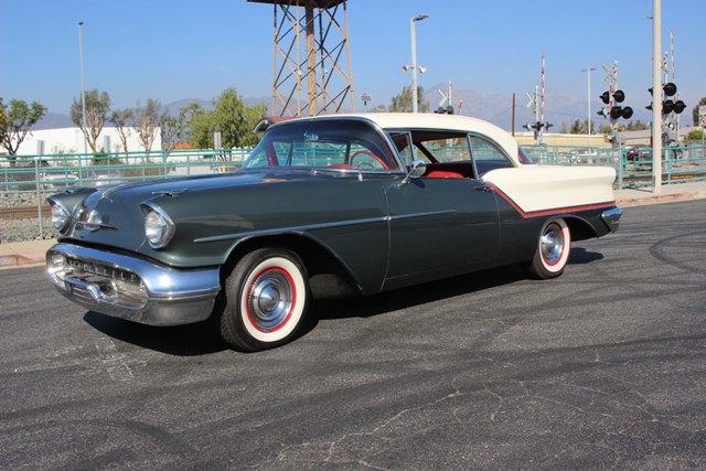 1957 OLDSMOBILE GOLDEN ROCKET 88 2 DOOR HARDTOP COUPE - This 1957 Oldsmobile is the rare Golden Rocket 88 2 door hardtop coupe, powered by the iconic 371ci V-8 engine with J2 tri power carburetor option. The odometer displays less than 73,000 miles and is believed to be original to the vehicle. Additional features include power steering, power brakes, power antenna, automatic Jetaway hydra- matic transmission and fender skirts. The exterior is very nicely finished in glistening chrome and brightwork, and a quality repaint in original code gray and white (1989). The expansive red and gray interior is like new. It runs and drives excellent. All mechanicals have been gone through. The engine and transmission were rebuilt in 2018 at 71,500 miles. Additional mechanical work performed in 2018 include: • New wheel cylinders • New brake shoes • New brake hoses • Brake booster rebuilt • Radiator rebuilt • Oil change and service • Rebuilt carburetor • New electronic fuel pump • New spark plug wires • New spark plugs • Complete tune up • New Coker wide white wall radial tires