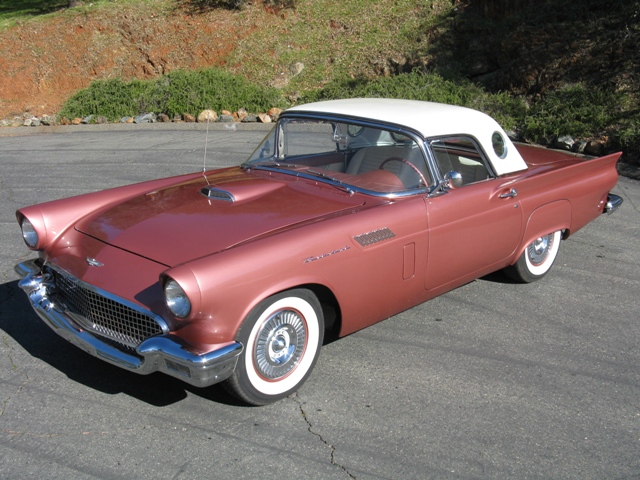 1957 THUNDERBIRD This cool 57 Bird has very low mileage on a rebuilt 312 ci engine, automatic transmission, a generator alternator conversion, new interior, new tonneau cockpit cover kit, Coker Classic white wall tires, a complete new exhaust system, new top seals, and re- chrome plated original bumpers.
