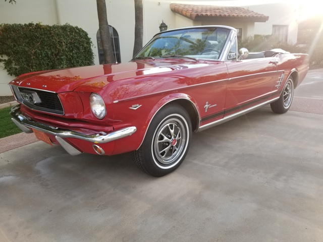 INCLUDES BOOK OF DOCUMENTS AND REGISTRATIONS DATING BACK TO 1968. 38 YEAR LONG TIME OWNERSHIP IN TEMPE ARIZONA. RECORDS OF ENGINE REBUILT AT AROUND 60,000 MILES IN 2014, NOW SHOWING 61,625 ON THE ODO. FINISHED IN CANDY APPLE RED WITH BLACK INTERIOR AND FEATURES 'C' CODE 289 - 2V V8 ENGINE AND UPGRADED T5 MUSTANG 5 SPEED TRANSMISSION, POWER STEERING, POWER TOP, DELUXE PONY STYLE STEEL WHEEL COVERS, ORIGINAL FORD BUCK TAG, WARRANTY TAG & VIN.