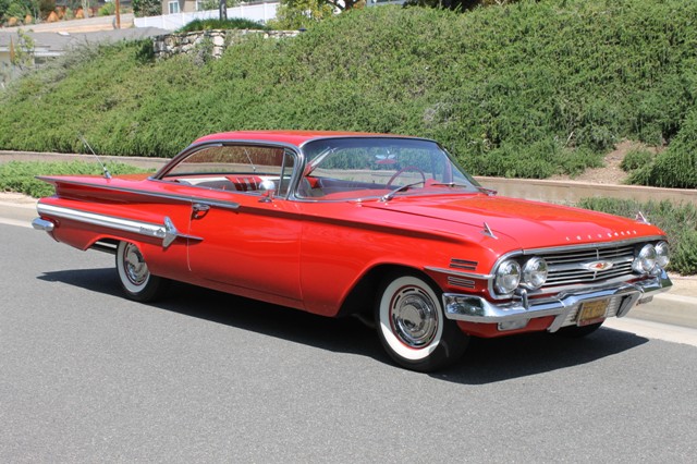 1960 Chevrolet Impala 348 Hardtop Sport Coupe - This Impala Sport Coupe is a factory Turbo-Thrust 348 and Air Conditioned car that was beautifully restored in its original Roman Red color, with exact and correct upgrades to 4 speed and tri-power! The paint and bodywork are beautiful, The interior is stock, authentic and correctly done in red and white houndstooth and red pepper carpet. The chrome and trim are shiny and gorgeous! It’s equipped with 348 V-8 , Power steering, power brakes, Air Conditioning, radio, heater, and dual antennas! The factory appearing 4 speed transmission and Tri-power were professionally upgraded. It runs great and is fun to drive.