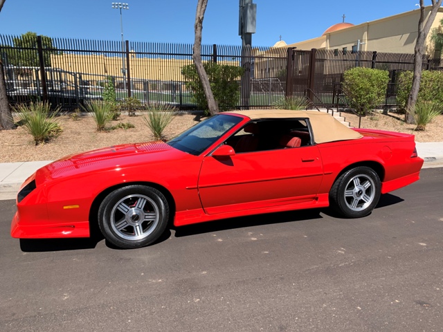 1991 Chevrolet Z-28 Camaro Convertible - This 1991 Camaro Z/28 convertible has 97,000 actual miles and is in all- original condition, accept for a recent repaint. Original interior and top. It is finished in Ultra Red Metallic and is powered by a 5.0-liter V8 TPI engine, which was the most powerful engine available in a Z/28 convertible. It is equipped with performance suspension, a 4-speed automatic transmission, G80 posi-traction rear and a Group #3 preferred equipment package. According to Carfax, recent service included dwell timing, air intake system, vacuum leaks, air fuel mixture, idle speed, spark plugs and wires replaced.