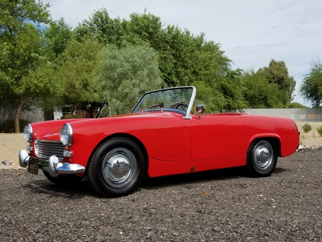AACA AWARD WINNING ROADSTER IN 2010. 1098 CM3 - 4 CYLINDER 56HP ENGINE WITH DUAL SU CARBS, 4 SPEED MANUAL TRANSMISSION, CORRECT CARDINAL RED EXTERIOR WITH BLACK INTERIOR WITH WHITE PIPING. NEW RAG TOP BOWS AND SIDE CURTAINS IN TRUNK. NEW TONNEAU COVER, STOCK WHEELS WITH RADIAL TIRES, BEAUTIFUL BUMPERS, CHROME & STAINLESS, DETAILED ENGINE BAY & TRUNK. TOTAL PRODUCTION IN 1963 8,852