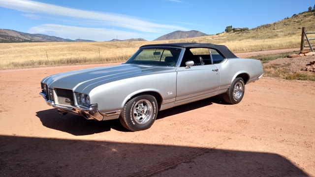 1971 Cutlass Convertible- V-8 350 motor with automatic transmission- ps ,pb ,pt and air conditioning - factory color Silver Frost with a new black top- bucket seats, console, sport steering wheel , dual mirrors and steel style wheels- Build sheet comes with the car. Beautiful car and drives like new.....