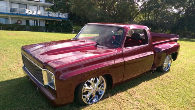 Over the top custom with 454 Crate motor, balanced, blue printed, 4bbl carb, 400 trans with stall converter, 4 inch chopped top, suicide doors, air bag suspension, fully lifting front end and air bagged lift on the bed, leather lined bed with maple, power windows and seats, 22" Falkens on the rear and 20" fronts, Azuka wheeels, dual electric fans, current registration and clear title, street driveable, Cadillac Escalade taillights, Cadillac burgundy wine paint, way more attributes to list, has a California license plate "I TILT" , under 2000 miles since built.