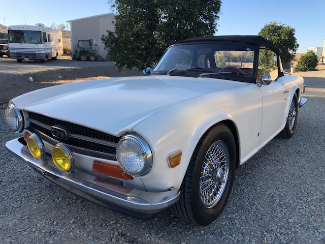 This 1973 Triumph TR6 roadster with its original 6 cylinder inline motor is featured in Arctic white with red leather interior and black canvas top. Body panels are all original, has been maintained over the years. Comes with extra parts and literature. Great California survivor.