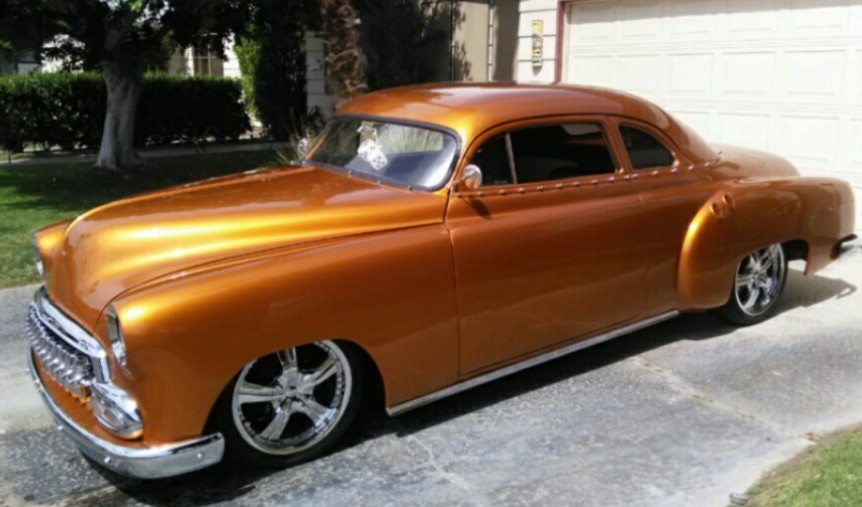 Purchased as a plain Jane, two years later and full restoration of both interior and exterior...she's all done! Chopped 1952 Chevy business coupe, paint color orange burst , black/white Interior, 350 V8 4 barrel, A/C, PS, 4 wheel power disc brakes, 4 speed automatic transmission, Frenched head lights, tail lights and dual antenna. Custom grill and all chrome replaced.