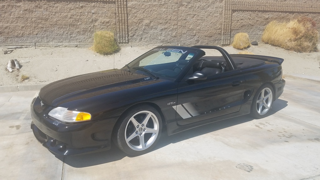 1997 FORD MUSTANG SALEEN S281 BUDGET CONVERTIBLE - AS PER THE SALEEN REGISTRY THIS BLACK EXTERIOR/BLACK INTERIOR CONVERTIBLE WITH SILVER GRAPHICS WAS MANUFACTURED IN JULY OF 1996 IN THE IRVINE, CALIFORNIA SALEEN FACTORY AND THE ORIGINAL DEALER WAS RACEWAY FORD IN RIVERSIDE, CALIFORNIA. IT WAS MANUFACTURED WITH THE FOLLOWING OPTIONS: SPORT BAR AND MAGNESIUM WHEELS. THE RECORDS ALSO INDICATE THIS PARTICULAR SALEEN IS 1 OF 6 WITH THESE EXACT COLORS AND OPTIONS. THERE WERE 128 BUDGET RENTAL SALEENS EVER BUILT (ONLY FROM 1996-1998). THIS IS ONE OF THE VERY FEW (BELIEVED TO BE 3) BUDGET RENTAL EXECUTIVE CARS THAT WAS NEVER PUT INTO THE RENTAL FLEET. A BUDGET EXECUTIVE DROVE INITIALLY AND PURCHASED THE SALEEN FOR HIMSELF IN 1998. HE OWNED THE CAR UNTIL 2013 WHEN HE PASSED AWAY FROM A SUDDEN HEART ATTACK LEAVING THE CAR TO HIS SISTER WHO OWNED IT UNTIL 2015. THIS IS ONE OF THE NICEST, IF NOT THE NICEST ORIGINAL PAINT, UNMODIFIED, COLLECTOR QUALITY SALEEN S281 BUDGET RENTAL CARS BUILT IN THE WORLD. THIS IS A REALLY AMAZING UN-RESTORED VEHICLE THAT HAS BEEN IN CALIFORNIA ITS ENTIRE EXISTENCE AND ONLY DRIVEN SPARINGLY AND ON NICE DAYS. THE ORIGINAL SALEEN EXCLUSIVE BORLA STAINLESS STEEL 2.5” MADREL BENT EXHAUST WITH MACHINE GUN INTER-COOLED TAILPIPE. EXHAUST LOOKS LIKE NEW AND STILL HAS THAT COOL DEEP BURBLE SOUND. SALEEN CAR COLLECTOR AND EXPERT ALEX MACKENZIE FROM PALM SPRINGS WHO HAS OWNED OVER 100 SALEENS, SHELBYS, MACH ONES OVER 25 YEARS WENT COMPLETELY THROUGH THE VEHICLE BOTH COSMETICALLY AND MECHANICALY IN 2019: • PROFESSIONALLY REMOVED AND STRIPPED THE FRONT BUMPER TO BARE URETHANE, RE-PRIMED AND PAINTED WITH 3 COATS OF BASE AND 3 COATS OF CLEAR. A NEW #82 BUMPER STICKER WAS APPLIED TO ORIGINAL LOCATION • NEW FRONT STRUTS, POLYURETHANE SWAY BAR END LINKS AND FRESH ALIGNMENT • ALL FRESH FLUIDS FROM FRONT TO BACK AND ALL NEW FILTERS AND BRAKES AND SERPERTINE BELT. • COMPLETE AIR CONDITION SYSTEM REBUILDING ORIGINAL COMPRESSOR AND CLUTCH, ALL NEW O RINGS, FLUSH, NEW ORIFICE TUBE AND FRESH OIL/FREON. • ORIGINAL WINDOW STICKER AND CONSOLE PLAQUE ON ORDER FROM SALEEN –DID NOT COME WITH ANY RENTAL CARS BUT COULD BE ORDERED BY NEW OWNERS • NOS MOMO ORIGINAL SHIFT KNOB AND SET OF NOS ORIGINAL S281 FLOOR MATS • NEW CLUTCH, PRESSURE PLATE, BEARINGS AND SYNCROS IN OCTOBER OF 2019