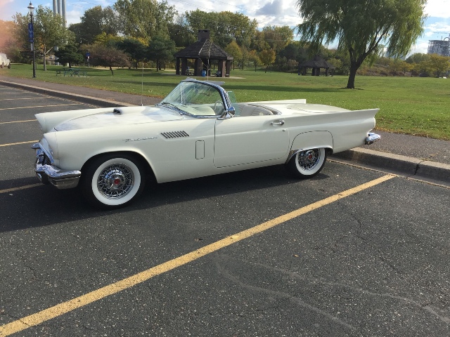 In 1955 Ford introduced what was to become one of the most iconic American automobiles ever built. The 2 seat Thunderbird roadster was introduced as a “Personal Luxury Sports Car” to compete with the first- generation Corvette. The 2-seat version of the T-bird was produced for only 3 years, 1955 through 1957. For the 1957 model year, the appearance of the Thunderbird was enhanced with a new grill, new bumpers and the addition of the now famous rear tail fins. The 1957 version is considered by most to be the most beautiful of the 2 seat Thunderbirds. This gorgeous Thunderbird immediately attracts attention wherever it goes with its original Colonial White body and matching Colonial White interior. The T-bird is very well equipped with power steering, power brakes, power windows, town and country radio and a soft top which folds down behind the seat. It is powered by the 312 cubic inch (5.1L) 4-barrel V8 producing 245 HP and mated to a 3 speed Fordomatic automatic transmission. New and real wire wheels with period correct wide white wall tires have been recently added. Although the tires are period correct for appearance, they are actually modern design radials for more comfort and safer ride. For dependability and safety, an electronic ignition module has been fitted inside the original appearing distributor cap. The generator original to the car has been replaced by a modern alternator that is however built into an original appearing generator case. These small modifications are virtually undetectable but make the car highly dependable. By nearly any measure, this beautiful Thunderbird appears exactly as it would have the day it was built. The car was originally built in Dearborn MI and delivered to Holmes Tuttle Ford in Beverly Hills CA. A gentleman in Canada is believed to be the 2nd or 3rd owner of the car. He owned the car for 35 years and performed a comprehensive restoration in 2011 including both a complete engine and transmission overhaul. Current owners purchased the car from the 2nd/3rd owner in Canada in 2016 and completed an extensive refresh in 2017. Items included; carburetor rebuild, several body panels painted, new windshield glass and window wing glass, intake manifold gasket, complete power steering rebuild, many new or re-chromed parts, new wheels and tires and much more. This T-bird has won numerous car show awards including Best in Class at the 10,000 Lakes Concours d’Elegance in 2017. The car has been meticulously maintained and kept in a climate-controlled garage for at least the last 40 years. It runs perfectly and is ready to be seen around town or driven out on the highway.