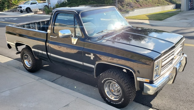 1987 Chevy K10 Silverado short bed 4x4 - 5.7 Liter 350 V8 Fuel injection, automatic overdrive, factory saddle dual gas tanks. All original California truck, no accidents, no rust, Black on Black Silverado package every available option power windows, locks, tilt, cruise, air conditioning, factory cloth interior, towing package. Runs and drives excellent everything works as it should very reliable hard to find square body.