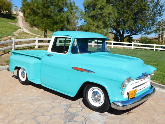 BEAUTIFULLY RESTORED 1957 CHEVROLET PICKUP, V/8 CHEVROLET MOTOR, TREMAC 5 SPEED TRANSMISSION, POWER DISC BRAKES, POWER STEERING , NEW CHROME AND BRIGHTWORK, NEW INTERIOR, SUPER NICE TWO TONE TURQUOISE AND WHITE PAINT, LOOKS AND RUNS GREAT, CALIFORNIA GOLD PLATE TRUCK.