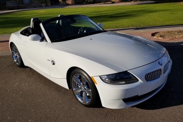 2007 Z4 ROADSTER WITH SPORT PACKAGE, ALPINE WHITE EXTERIOR WITH BLACK LEATHER INTERIOR. BLACK STAFAST CONVERTIBLE TOP, PREMIUM SOUND, FACTORY 17 INCH CHROME WHEELS ON BRIDGSTONE POTENZA TIRES, 3.0 INLINE 6 ENGINE, STEPTRONIC AUTOMATIC TRANSMISSION WITH PADDLE SHIFT. 2 SETS OF KEYS WITH FOBS, COMPLETE SET OF BMW Z4 BOOKS, CLEAN CARFAX HISTORY REPORT AND ONLY 73,000 MILES.