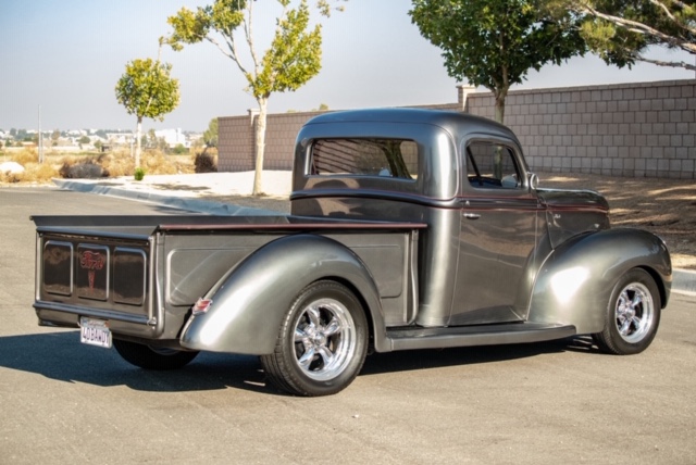 Complete Frame off rebuild - 5 Liter (302 ) ford engine with AOD automatic overdrive transmission, Mustang II front end with disc brakes, 9 inch ford rear end, fuel injected, Headers, dual exhaust, Electric exhaust "Cut outs", custom bodywork including 3 inch chop, custom dash, Large electric rear window rear window Yes, it goes up and down, Electric windows. Red and Gray Leather interior, Custom Autosound Radio, African Mahogany bed wood with white maple inlays, Air conditioning (Cold) and less than 100,000 miles since restoration.