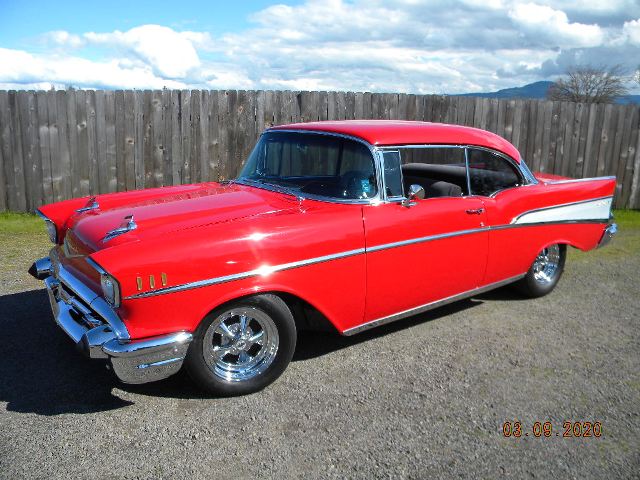 1957 Chevrolet Bel Air 2-Dr. Hardtop. 350 cu. in. small block with a Holley 4bbl. atop a polished Weiand Supercharger. TH400 Automatic Transmission, Power Steering with 605 style box, Power Disc Brakes, Air Conditioning, Tilt Wheel, Tinted Glass and Custom Stereo with CD Stacker. The exterior is finished in Torch Red, applied over a stunning rust free southern California original sheet metal body. The chrome and stainless trim are nearly flawless. The body fit is exceptional. This beauty rides on a set of vintage style 15" Cragar 5-spoke mag wheels, shod with 215/60/15 Good Year Eagle ST's up front and 255/60/15 Eagle ST's in the rear. The interior features custom cloth upholstery, cloth headliner, Boyds leather wrapped billet steering wheel, and all new, custom tinted glass. In fact, the previous owner aquired the car (for the sum of $85,000) from a resident of Coto de Caza, who stated that this amazing Bel Air was one of Boyd Coddington's early projects. However, we have no documentation to support that theory. The stock gauges are complimented by an additional temperature gauge to keep an eye on whats going on under the hood. The trunk is carpeted to match the interior, creating a quieter ride. Mechanically, the powerful small block is mated to a TH400 Automatic transmission. The headers and complete custom dual exhaust are coated with a ceramic coating. The engine starts easily and has good manners, despite the performance nature of this beast! It idles nicely and runs cool, thanks in part to the aftermarket radiator and electric fan. The front of the engine is set up with a billet aluminum accessory drive belt system. With the supercharger and the chrome and billet accents, this is one engine bay you will be proud to show off! The undercarriage features a powder coated frame and other components as well as some parts finished in gloss black paint, which provides evidence of a frame-off build (an often over used term). There is no rust, and the floors look amazing! Overall, this is an amazing build that would cost in excess of $100k if you were to duplicate it today.