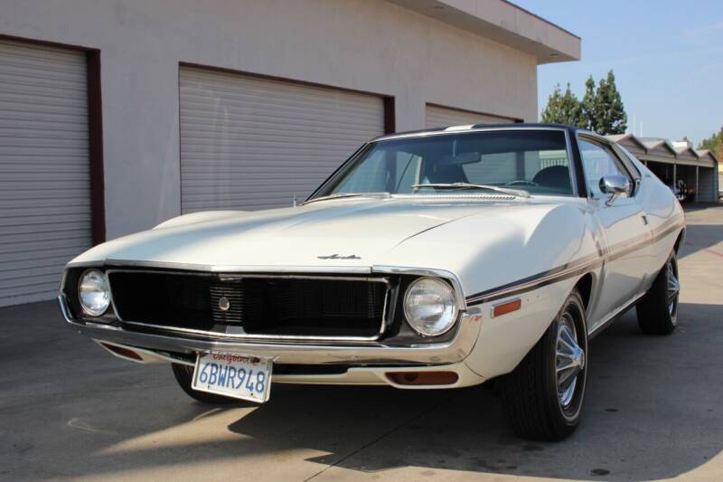 This 1971 AMC Javelin SST is a second-generation example that we acquired in June of 2020. The previous owner of this vehicle reportedly purchased it from the daughter of its original owner. The car is finished in white with black vinyl roof inserts over a blue interior, and power is from a 304ci V8 mated to a three-speed automatic transmission. Additional equipment includes power steering, a front sway bar, and an AM/FM/cassette stereo. A carburetor rebuild and oil change have been carried out along with installation of an aluminum radiator, fresh brakes, and a new battery. This Javelin SST is offered with recent records and a clean California title. The body was refinished in its original Snow White in the mid-2000s following repair of a dent in the driver-side quarter panel. Exterior features include a twin canopy- style roof with black vinyl inserts, a roof lip spoiler, dual black side stripes, and SST badging. Factory 14 inch steel wheels are fitted with full covers and KM Radial 40 whitewall tires. The previous owner stated that the brake shoes, master cylinder, horn, and emergency brake cable have been replaced. The interior features high-back front bucket seats upholstered in pleated blue vinyl with matching door panels and carpets, while the instrument panel and door inserts are trimmed with woodgrain appliqués. A Sparkomatic AM/FM/cassette stereo occupies the factory radio position. A factory deep-dish steering wheel frames a 120-mph speedometer and a combination fuel level/coolant temperature gauge. The five-digit odometer shows approximately 1,600 miles but most likely has exceeded the mechanical limits of the odometer. The tall-deck 304ci V8 is equipped with a two-barrel carburetor with an electric choke and was rated at 210 horsepower and 300 lb-ft of torque when new. Power is sent to the rear wheels through a column-shifted Borg-Warner three-speed automatic transmission.