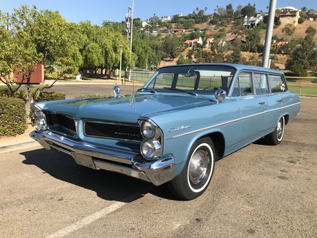 Mileage: 78, 300 (original miles) Originally Purchased from Harry Maher Pontiac, in N. Hollywood, CA on May 13, 1963. Resided most of it's life in Burbank, CA (1963 – 2003) and in Orange, CA (2003 to present). I purchased car from the original Owner's Family in 2003 with 66,265 miles on the odometer. I am the second Owner of this, well maintained, family Station Wagon. This vehicle is pretty much 'original' except for maintenance items and accessory Items I have added (Engine Instrumentation, Factory Dash Clock, Seat belts, rear-facing 3rd Row Seat, new carpet, door seals and the new exterior paint in 2020. I have the Original purchase paperwork, the Original User's Manual and Sales Brochures. Basic Equipment: Factory Power Brakes, Steering, Trailer Hitch and removeable Ball Mount. 389 Cu In - low compression V-8 (with 2-Barrel Carburetion). Automatic Transmission (3-Speed Roto-Hydramatic). Fresh custom Repaint in the Factory color: 'Yorktown' Blue Metallic – Clearcoat. Original Accessories: Decor Group: Original Tri-color Vinyl Upholstery, deluxe Front Seat Padding and color-keyed carpet and 'Ventura’ Clear Steering Wheel and horn rim. Lamp Group: Dash Reading Light, Swivel-Ceiling Map Light. Mirror Group: Factory Dual Rearview Mirrors (Front fender mounted, Driver’s is Remote). Deluxe Pushbutton AM Radio. Electric Tailgate Window (with dash remote Switch and exterior Key switch). Trailer Group: Rear Receiver Hitch, removeable Ball mount and Lighting and Brake Connector. 4-Ply Polyester W.W. Tires and Full-Size Stainless Turbine look Wheel Covers. Dealer Installed York Under-dash Air Conditioning system. Upgrades/repairs – since purchasing the vehicle in 2003…I have added: New coil Springs, Bushings and Gas Shocks - Front axel. Load-Leveler Air Shocks and bushings - Rear Axel. Water, Fuel and Oil Pumps replaced and Carburetor rebuilt. Radiator ‘re-cored’ and pressure tested, 5050 mixture - Prestone coolant used. All new Hoses and Belts, and ignition parts. Gas Tank R &R and treated with baked-on 'Renu' - lifetime anti-rust process. Transmission R &R for new seal kit gaskets installed. New Universal Joints (2) on Drive Shaft - replaced. Extra spare Rim and proper size Tire purchased for spare (to fit in the rear fender compartment). All Windows, Doors and Locks serviced and functioning, smoothly, for the age... Electric Tailgate Window “Up Down function” works, but “Up” has never been “speedy”. New Carpet OEM Floormats/ Seatbelts – throughout, with Front belt Retractors installed. “Pontiac monogrammed” Visor Make-up Mirror added for passenger use. Rear-facing third Seat (Two Passenger) installed. Added Safety Instrumentation: AutoMeter gauges: Temp, Oil, Vacuum (2-1/16"), under-dash, and Tachometer 3-38" on side. Factory NOS dash Clock installed (rebuilt/upgraded to a more reliable Digital clock movement). Car’s Condition: Engine and Transmission have been recently service and operate normally. Car drives and handles well for 1960’s car expectations. Car to be driven to Palm Springs from Orange, CA. Deficiencies: Interior shows some minor wear and slight discoloring (original factory upholstery). Ventura Steering Wheel - Lucite Clear portion has some checking yellowing as expected). Radial tires installed for stability and are Firestone FRS-380 Tires. They are in fair condition, but are Out of Date (more than four years old and need replacement). AC operates, but does not chill (probably needs seals, again, and an R-12 Recharge). Cabin Heater Core is disconnected - needs replacement. (a 12V Electric Heater is provided). Vehicle drips some Engine and Transmission oil (not excessive, but that is a subjective statement