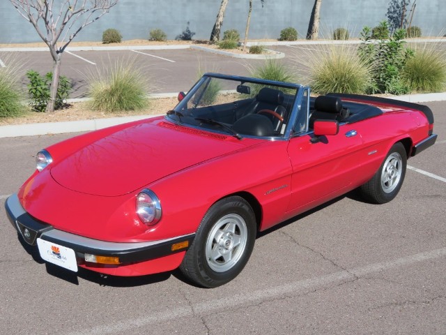 1986 Alfa Romeo Veloce Spider just came out of a high end local collection and is bar none the best 80s Alfa Spider currently on the market and has super low 42,000 original miles. Well equipped with a new top, Ice Cold factory a/c, premium interior, and all books and records. Finished in THE best color combo of Alfa Rosso over Black Leather interior. This is the quintessential 80s car to own and will be sure to be an appreciating asset with such museum worthy low miles. This car has already been PPI inspected by a local Alfa expert and passed with flying colors and great compression. The car also just received a brand new set of performance radials. 1,962 CC DOHC Inline 4-Cylinder Engine Bosch L-Jetronic Fuel Injection 115 BHP at 5,500 RPM 5-Speed Manual Gearbox 4-Wheel Disc Brakes Front Independent Suspension Rigid Rear Axle with Radius Arms and Telescopic Shock Absorbers