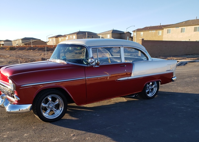 1955 CHEVROLET 210 2 DOOR POST. FEATURES 350 CHEVY ENGINE WITH CAMEL HEADS, MALLORY ELECTRONIC IGNITION, HOLLEY 600 CARB, EDELBROCK INTAKE, VALVE COVERS & AIR COVER, TURBO 400 AUTOMATIC TRANSMISSION, B&M SHIFTER, CUSTOM EXHAUST AND HEADERS, ALUM RADIATOR, POWER STEERING, FRONT POWER DISC BRAKES, CHROME TILT WHEEL, LACARA STEERING WHEEL, FRONT POWER WINDOWS, ALL NEW SUSPENSION BUSHINGS, NEW SUSPENSION PARTS, NEW REAR AIR SHOCKS, CARPET IN EXCELLENT CONDITION, NEW AMERICAN RACING WHEELS, 1959 CORVETTE FRONT GRILL. HAS ALL CHROME PARTS.