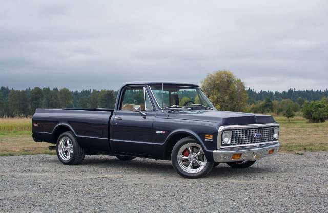 71 Chevy C10 pickup. Beautiful Resto Mod in Midnight Blue metallic over beige. 350 V8, Vintage Air, power front disk brakes, full gauges, custom tweed interior, 18-inch American Racing polished mag wheels, and dual exhaust.