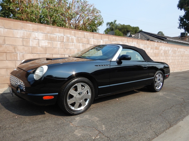 2002 Ford Thunderbird, this black on black t bird is in very nice mechanical and cosmetic condition. With only 83000 Miles it this car has been well serviced as seen in the car fax report in the photos. No exterior damage, some small chips, and scrape shown in the photos, excellent black convertible top that is power and working, everything works in the car. Factory chrome wheels on new tires. Interior is black leather and also very tidy w no issues, no check engine or warning lights, Ice cold AC, cd changer, full power, factory books. Car fax shows damage reported due to a person bumping the rear bumper at a light, this damage was over $500 do it was reported , the rear bumper was repainted, all body panels are original and still have the ford vin decal on every panel. Never in an accident, It carries the car fax guarantee.
