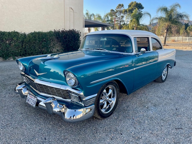 1956 CHEVROLET 210 TWO DOOR SEDAN - ZZ4 Crate Motor – Aluminum 350 Cubic Inch 350 Horsepower , Tremec 5-Speed , 3:43 Posi Rear End , 2” Drop Spindles , Front Disc Brakes , Front & Rear Stabilizer Bars , Vintage Air , Serpentine Belt System , Correct Headers for ZZ4 D shaped Exhaust Ports , New Exhaust System , Power Rack & Pinion Steering , Battery Relocated to the Trunk , Shaved Door Handles & Locks , Dakota Digital Dash , Tilt Steering Column , Front & Rear Seat Belts , JVC Radio/CD Player Sound System