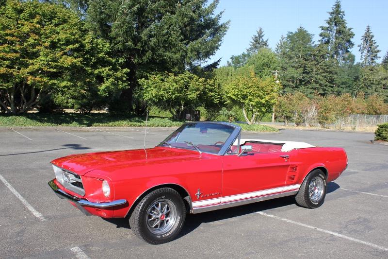 This 1967 Ford Mustang Convertible GT Tribute is powered by a 289ci V8 paired to a 3-speed automatic transmission. The car is finished in beautiful red over a two-tone red and parchment Pony interior, and equipped with a white power soft top, with glass rear window and matching vinyl boot. The 5-digit odometer reads approximately 14452 miles. The car was repainted in its factory color under previous ownership. Amenities include dual exhaust, lap belts, crank windows with wing vents, and an AM/FM radio. A 3-spoke steering wheel sits in front of round gauges including a 120mph speedometer as well as fuel level, oil pressure, coolant temperature, and alternator output. The 289ci V8 sends power to the rear wheels through a 3-speed C4 automatic transmission. A great solid driver example of one of the most popular cars of all time.