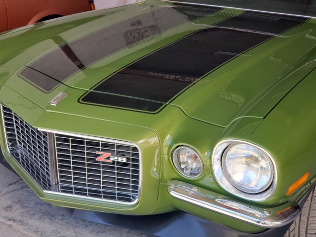 1970 Z-28 Tribute with rally sport lights covered in Citrus Green factory matching paint, base coat, clear clear coat high quality finish. Powered by a built 350/ 350 sbc with Edelbrock aluminum heads and intake manifold topped with a 4 bbl carburetor. The engine also sports a upgraded cam and long tube headers. Plenty of power here on tap. This is a fresh high quality restoration and beautiful representation of the legendary Chevrolet Z-28. Perfect for anyones collection.