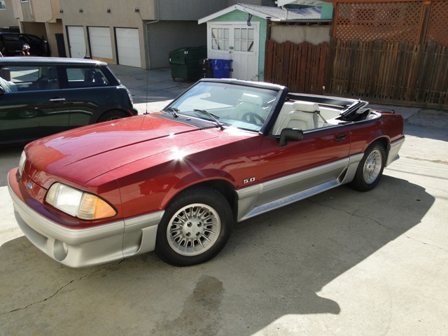 1990 Ford Mustang GT convertible - 38K original miles. Clean rust free car, 5.0 V-8 225 HP. Rare Wild Strawberry with White leather interior. Full power Brakes, steering, windows, locks & top. Premium Stereo System, Ice Cold A/C. Sharp fox body Mustang!
