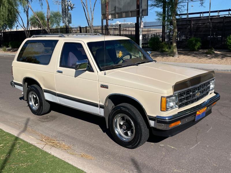 The truck is finished in Tan Beige with white lower accent color and features front and rear chrome bumpers with black rub strips, a roof rack, a rear wind deflector. Factory 15” steel Rallye wheels wear 215/75 Arizonian Silver Edition on all four corners. Braking is handled by power-assisted discs in the front and drums in the rear. The interior features factory brown and beige cloth upholstery that was part of the Tahoe trim package. Other amenities include cruise control, a tilt steering column, zippered rear storage pockets, an AM/FM stereo with a cassette player, and air conditioning that was retrofitted to use R134a refrigerant. A two-spoke steering wheel fronts an 85-mph speedometer, a tachometer, a trip odometer, and gauges for fuel level, coolant temperature, voltage, and oil pressure. The six-digit mechanical odometer shows 140k miles. The fuel-injected 4.3-liter V6 was factory rated at 150 horsepower and automatic transmission that drive smooth. The Carfax report shows 2 owners in the state of Arizona since new!