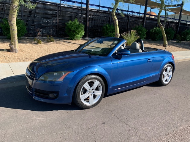 This Arizona Audi TT is finished in Ocean Blue Pearl Effect with a black cloth power convertible top. This TT has grey leather and suede seats that are clean and free of an rips or damage. This TT is powered by a 2.0L I4 turbocharged engine that produces 200hp and 207ft. lbs. Of torque. A shiftable automatic transmission offers manual transmission operation as an option. A FREE CARFAX HISTORY REPORT SHOWS CAREFUL OWNERS AND NO ACCIDENTS! With only 66,000 miles and has been well cared for. Recent services were performed to the convertible top, engine oil and new battery.