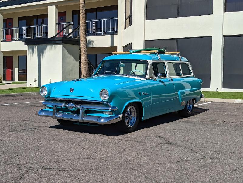 1953 Ford Ranch Wagon Custom California Surf Build. This custom restored 1953 Ford Ranch Wagon is powered by a period correct flathead V8 engine mated to a 3-speed transmission. It rides on Cragar custom wheels and has been upgraded with power brakes. The interior features an upgraded Autometer gauge cluster and Pioneer stereo that has Bluetooth, satellite and USB connections. The vintage bamboo surfboard rack and surfboard complete the look of this custom beach cruiser. Beautiful Restoration on this Rare Ranch wagon In Stunning 50s Tropical Turquoise Exterior and Cameo White. Interior has been completely restored and trim and chrome is beautifully appointed. Has been driven only 920 miles since restoration.