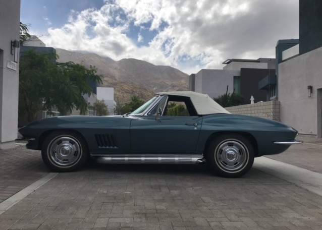 Some cars are bought to add to a collection and are never driven. Some cars are bought to drive, they make it to Cars and Coffee on the weekends, they do parades, they are admired, honked at and constantly get the 'thumbs up'. People stop you to tell you the stories they have when they had the same car. That is this car, it's a solid driver. The car had a bunch of maintenance and minor restoration done in 2016, then it was parked and driven occasionally with extreme pleasure. This is a fast and fun car to drive, the side pipes are an added bonus of great sounding American muscle. The car is currently kept covered in air-conditioned garage in Palm Springs. This 1967 Chevrolet Corvette soft top convertible is powered by a replacement 327/350hp V8 with side pipes, paired with a four-speed manual transmission. This is not a number matching car, the CE number that is CE6N21012. The white soft top is in great shape, the top framework articulates up and down smoothly and the weather stripping was renewed in 2016. In 2016 the whole car was gone through and freshened up. Not much is known about the history of the car, although originally it was an East Coast car, and at some point somebody paid good money for a repaint from Rally Red to Lynndale Blue and change the red interior to black. The paint is in good shape and shines up incredibly nice, there are the typical signs of a car that is driven- there are some chips, small random area of light paint bubbling and very small and minor cracking in one area in drivers side rear. This car did not originally come with, nor does it now have air conditioning or power steering. All chrome and body pieces, both interior and exterior are in place, functional and look fantastic. Work done in 2016: o New window seals, tracks and cranks o New correct rear valance replacing the broken and original valance for straight pipes o New tires New ignition shields/chrome New Holley 4160 carburetor o New engine and heater hoses o New turn signal collar and mechanism o New turn signal switch o New gas tank sending unit and gaskets o New intake manifold bolts o New hood hinge bolts, springs and retainers o New hood release cables o New seat bushing, track rollers, screws, bolts and knobs o New firewall grommets New washer pump valve kit o New temp sending unit o Most of the interior screws have been replaced with the correct new screws o New seat back levers o New door locks set o New door knobs o New shifter boot, plate and ashtray cover o New headlight knob and rod o New expansion tank straps o New Top header front and side weatherstripping and fasteners