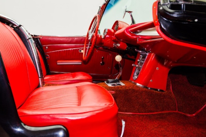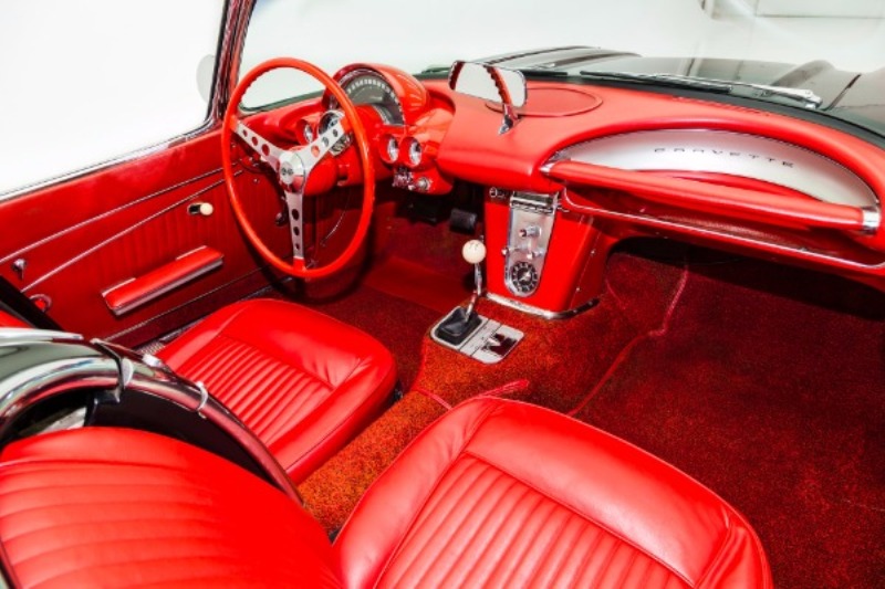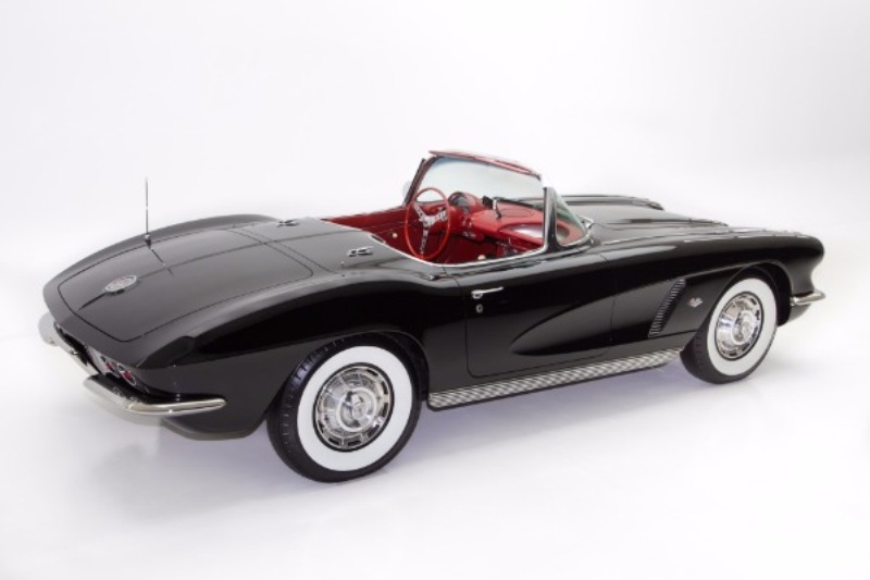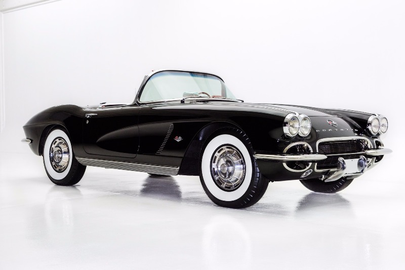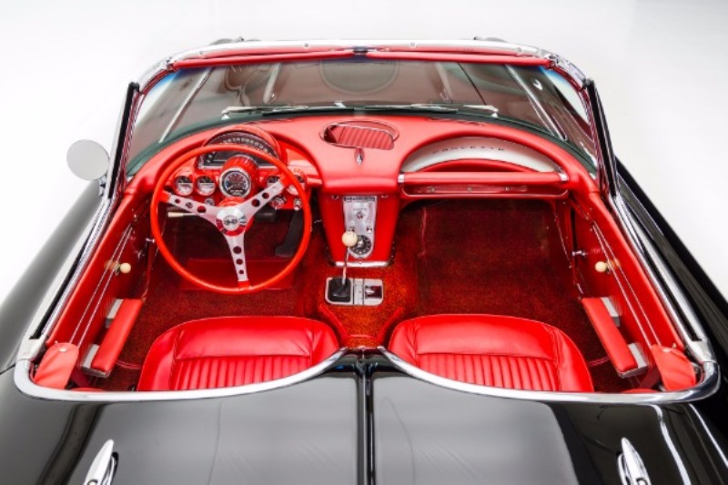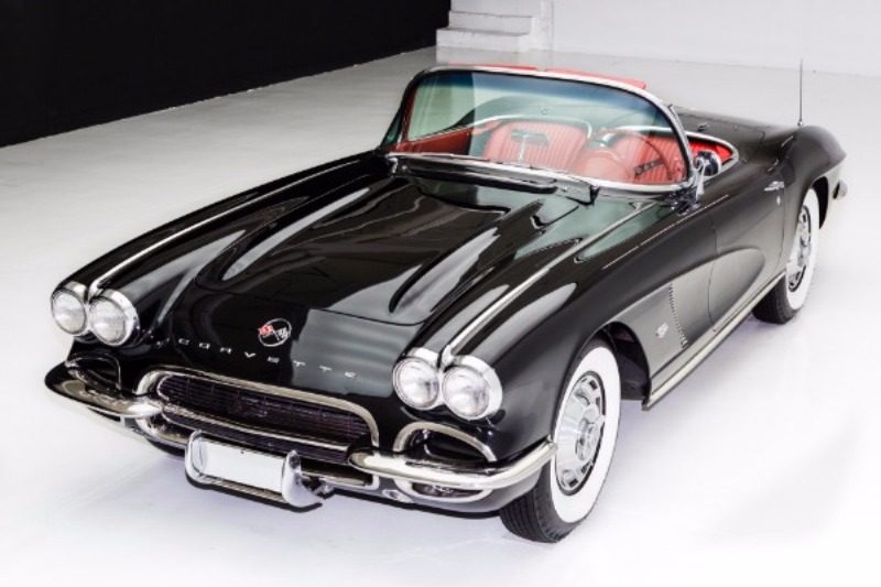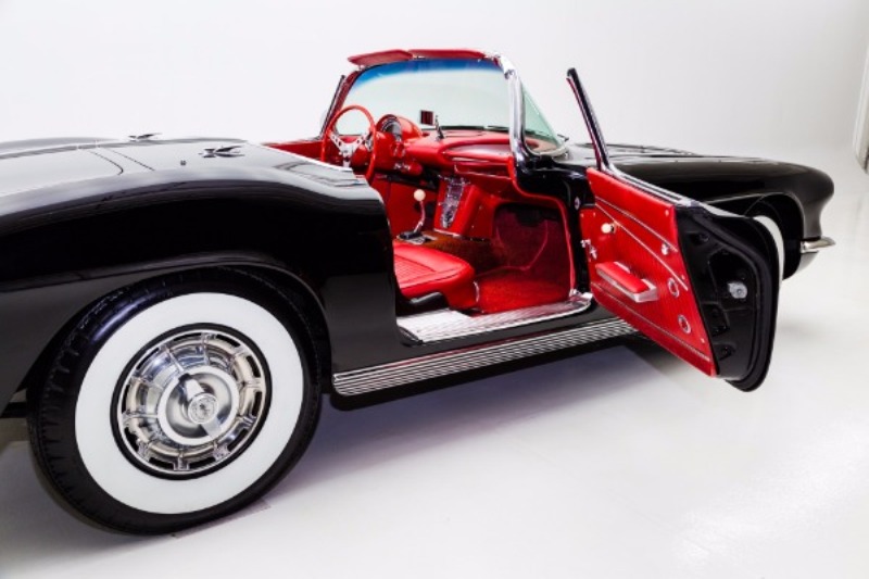 1962 CHEVROLET CORVETTE ROADSTER - Fresh Comprehensive Restoration, Factory Matching Numbers 327 V8, Factory 4 Speed Transmission, Finished In The Most Desirable Color Combination; Tuxedo Black With Red Interior. Two Tops, White Soft Top and Black Hardtop. Factory Spinner 62 Vette Wheel Covers. Added Blue Tooth Stereo System.