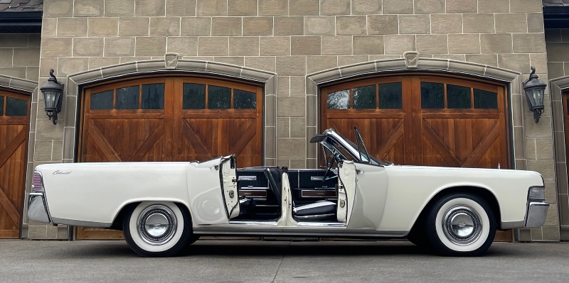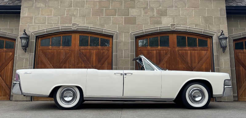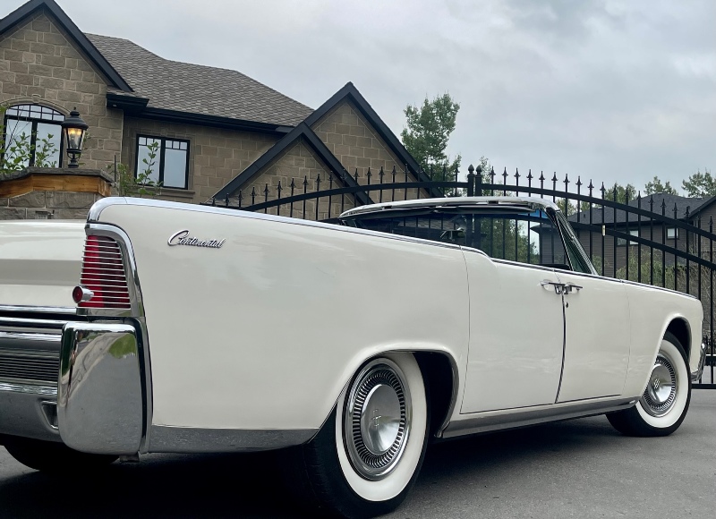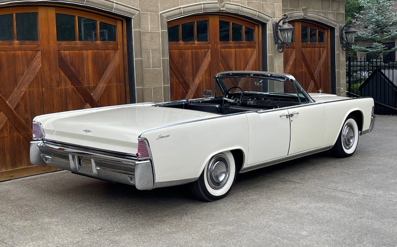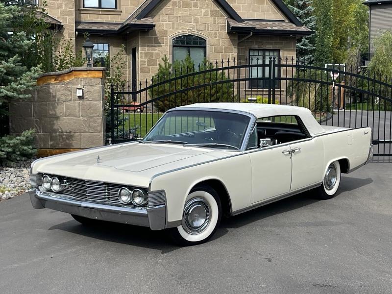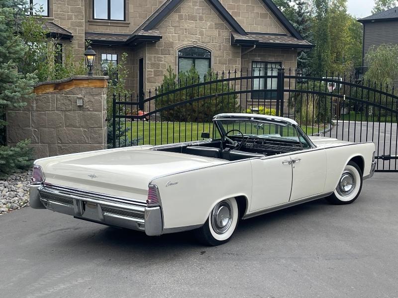 1965 Lincoln Continental Suicide Door Retractable Convertible. This triple white Continental is 1 of 3,356 convertibles produced in 1965 and retains its factory 430 CI V-8 engine with added Holley Sniper Fuel Injection complimented its factory three speed automatic transmission. The exterior has been finished in its factory M Code Arctic White exterior complimented with its restored white - black leather interior and new white convertible top. Additional features include, Factory climate-control system, Power steering and brakes, Power window, Power seats, Push button AM radio, factory Continental wheel covers with period Correct Wide White Tires, power retractable convertible top. this legendary suicide door 65 continental retractable convertible has only 28988 actual miles.