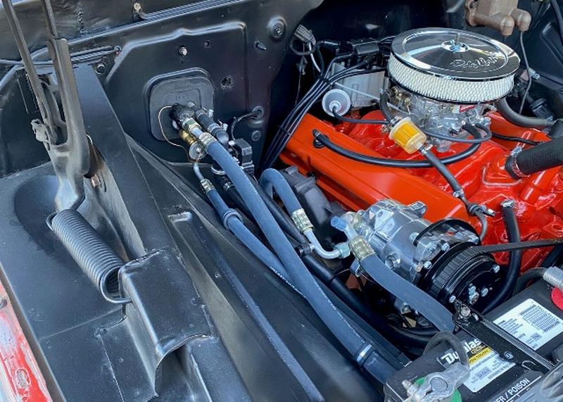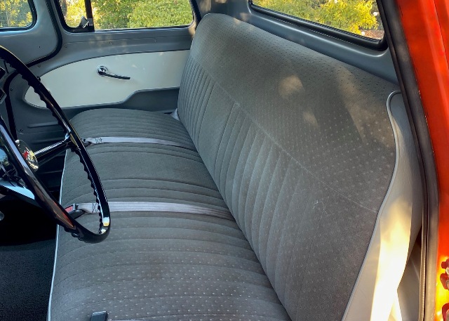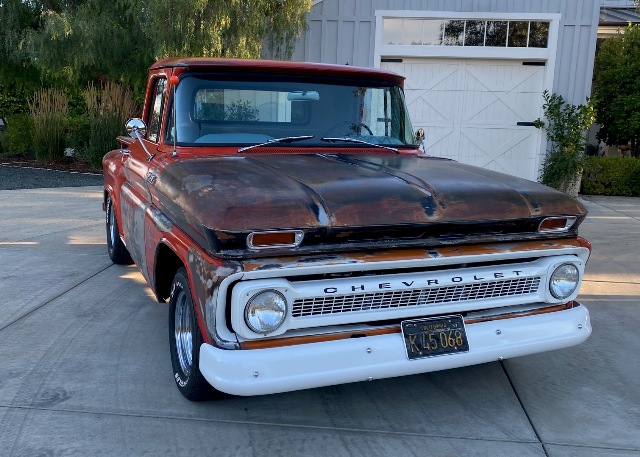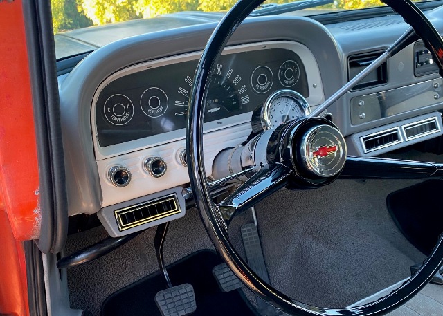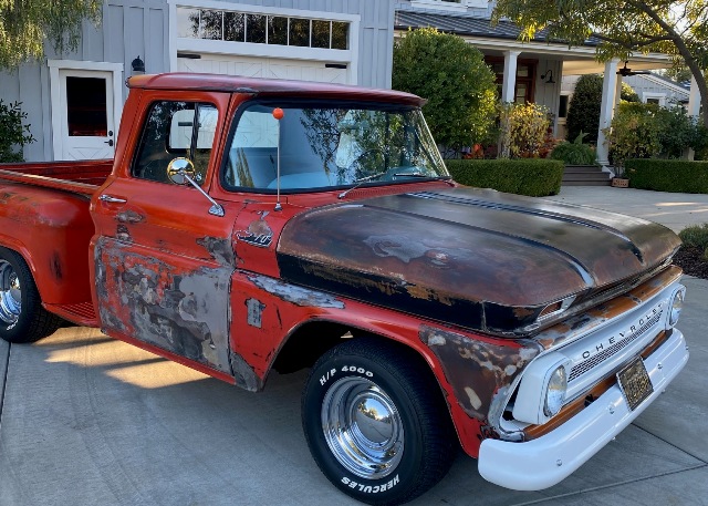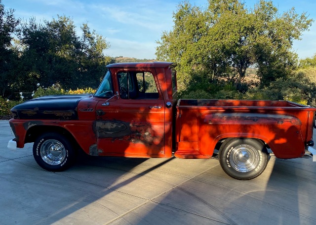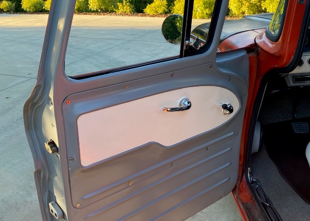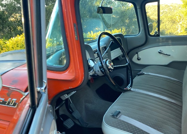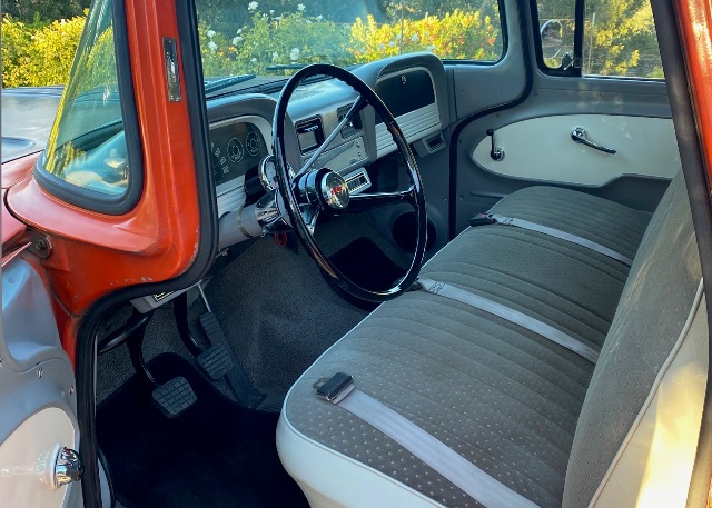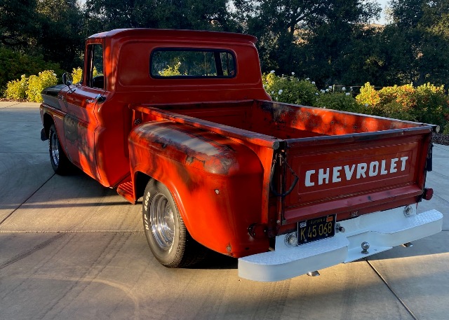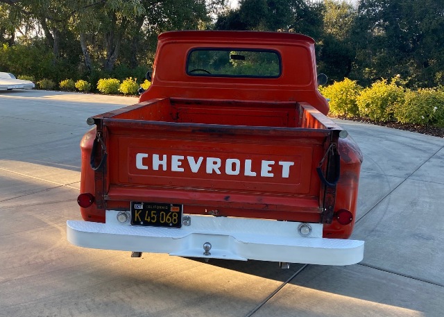 A restored truck with a cool patina orange finish. Has 283 V8 and 3 speed manual transmission and a/c. The following items are either new or rebuilt: dual exhaust, alum radiator, brakes, wheel and master cylinders, tires, battery, water pump, fuel pump, Edelbrock Carb, upper and lower ball joints, upper and lower A arm bushings, inner and outer tie rod ends, idler arm, tension bar, 3 inch lowering springs, rear axel trac bar bushing, 3.38 gears, turn signal switch, Led tail lights, emergency flashers, back up lights, tachometer, steering column upper bushing, front wheel bearings, instrument panel and gauges, all window seals, windshield, steering wheel, electric fan, kick panels with speakers, Bluetooth amplifier and interior. Runs and drives like new!