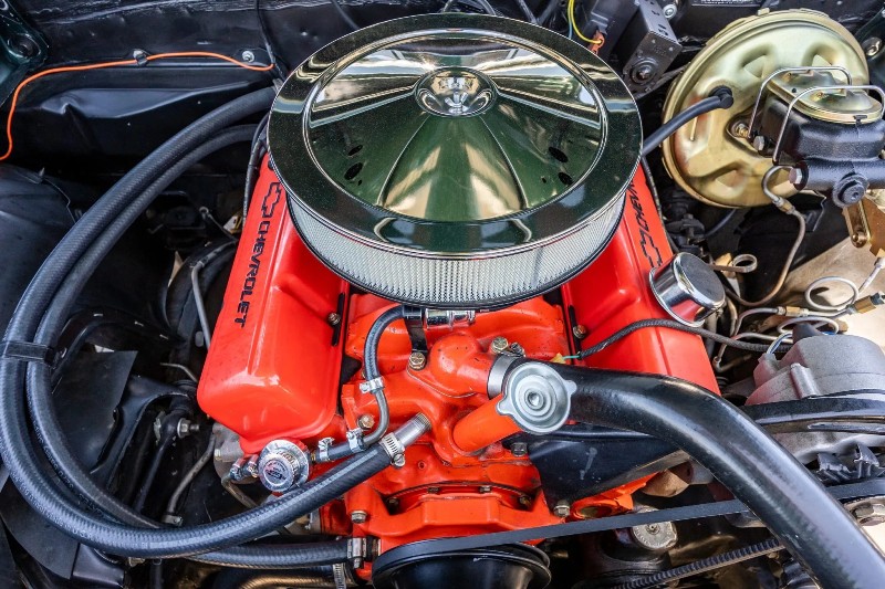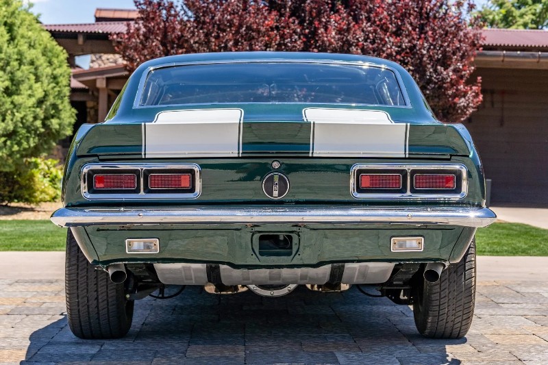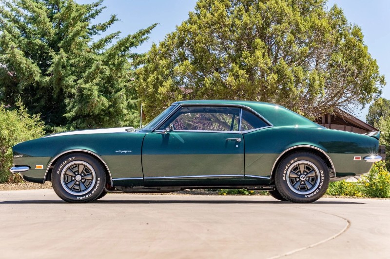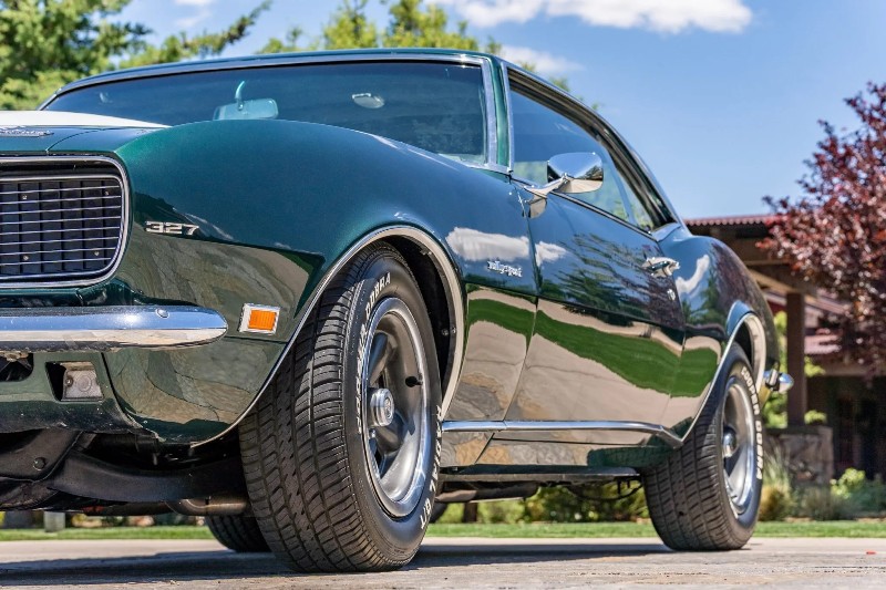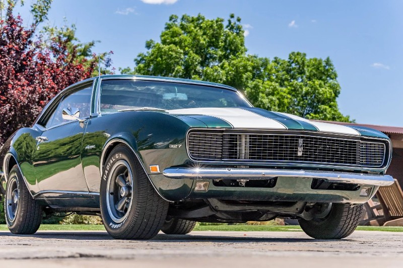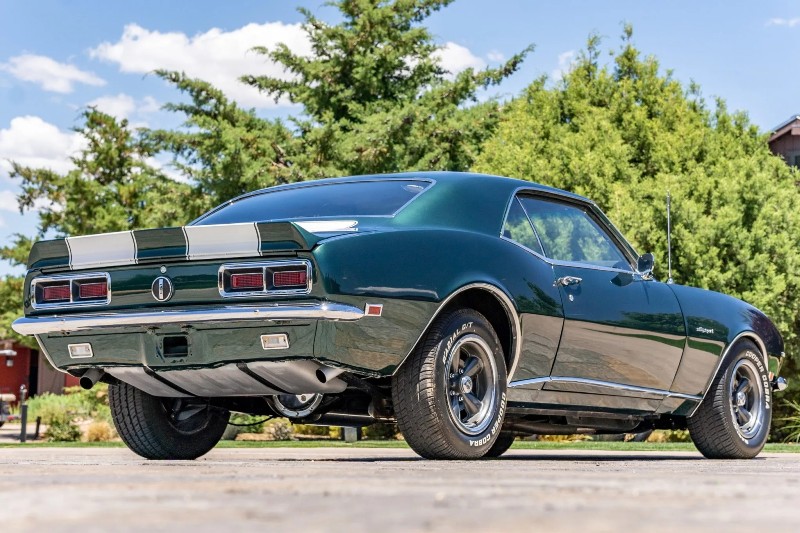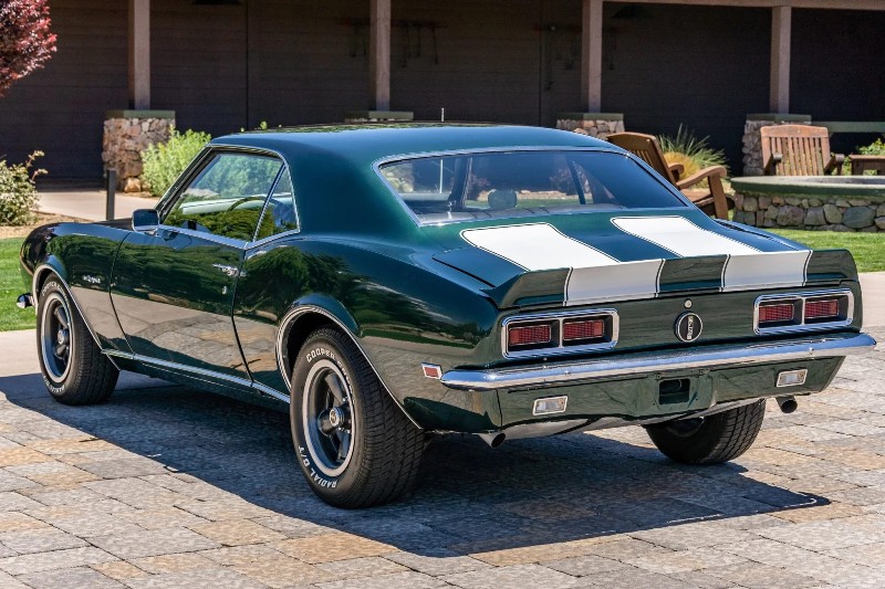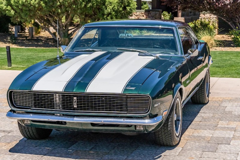 1968 Chevrolet Camaro RS coupe - This Original Camaro RS is a 2023 Best in Show Winner, underwent a mechanical and cosmetic restoration. Powered by a number matching 327ci V8 linked to a two-speed automatic transmission, the car is finished in the British green (Code ZZ) with white stripes over black vinyl upholstery. Equipment includes a cowl hood, a rear spoiler, hideaway headlamps, power steering, power front disc brakes, 15 inch rally-style wheels, woodgrain trim accents, and a retro-style digital stereo, rear spoiler, hideaway headlamps, white hood and decklid stripes, dual mirrors, 327 and Rally Sport badging, and chrome bumpers.