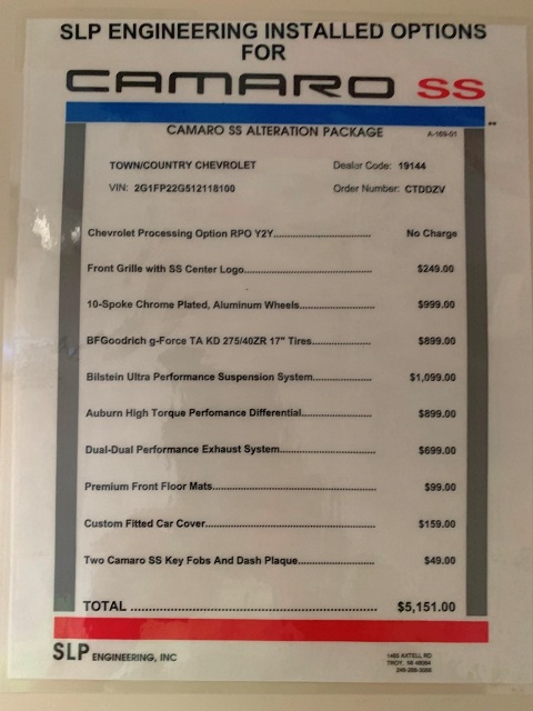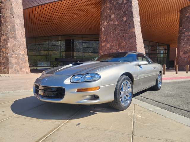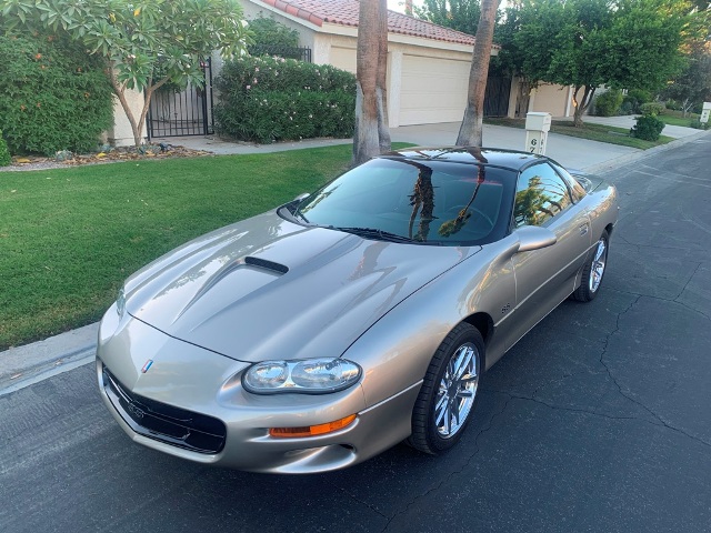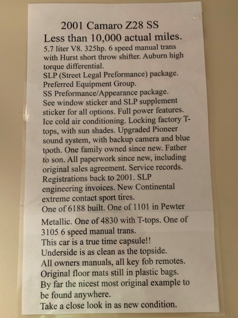 2001 Camaro Z28 SS Less than 10,000 actual miles. 5.7 liter V8. 325hp. 6 speed manual trans with Hurst short throw shifter. Auburn high torque differential. SLP (Street Legal Preformance) package. Preferred Equipment Group. SS Preformance/Appearance package. See window sticker and SLP supplement sticker for all options. Full power features. Ice cold air conditioning. Locking factory T-tops, with sun shades. Upgraded Pioneer sound system, with backup camera and blue tooth. One family owned since new. Father to son. All paperwork since new, including original sales agreement. Service records. Registrations back to 2001. SLP engineering invoices. New Continental extreme contact sport tires. One of 6188 built. One of 1101 in Pewter Metallic. One of 4830 with T- tops. One of 3105 6 speed manual trans. This car is a true time capsule!! Underside is as clean as the topside. All owners manuals, all key fob remotes. Original floor mats still in plastic bags. By far the nicest most original example to be found anywhere. Take a close look in as new condition.
