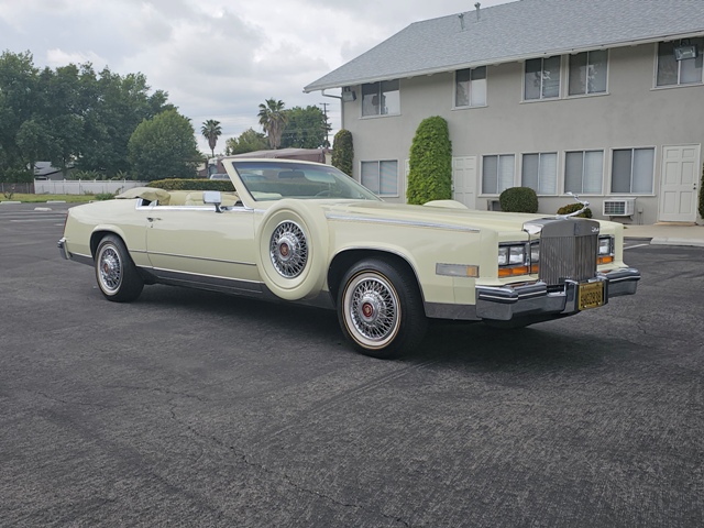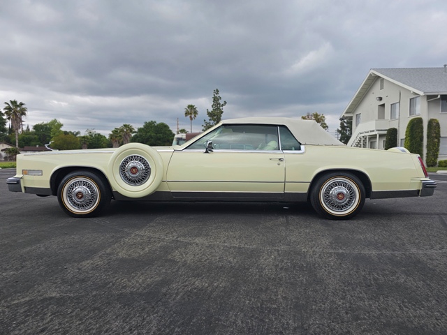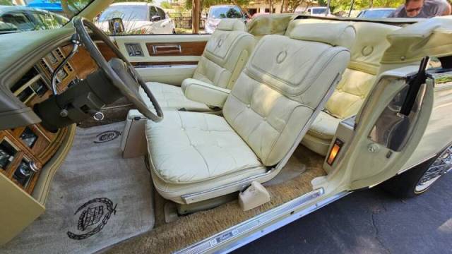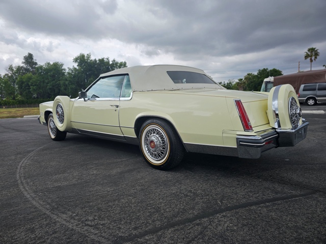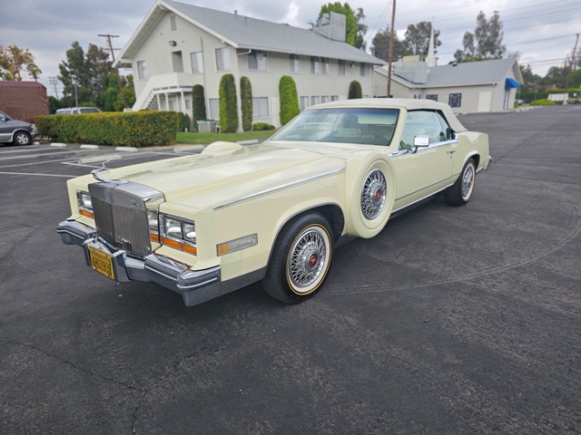 1981 Cadillac Eldorado Custom Convertible, this 19000-mile example has been in a few collections and is now available for its new owner, built in 1981 in Florida by American International Coach Works there is not another one like it. The body has been Lengthened approx. 18 Inches w the extra room coming from the motor compartment, The chassis has been upgraded to accommodate this. Excellent light pearl yellow exterior no dents, wonderful luster, off white power top, and light soft leather yellow interior w a tan carpet contrast, excellent chrome and brightwork as well as stainless trim, Custom grill, side Faux spare wheels, rear continental kit, Wire wheels w Vogue tires. All Power items are working, AC blows cold just serviced, top, windows, seats, Lights, signals, interior lights, dome light turns on when driver door handle is pushed, Self-Level suspension is functioning, soft leather, door panels and dash are good, Always an Inside stored vehicle, Car drives wonderful, optional PA system w animal noises, sirens etc.