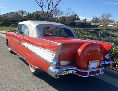 1957 Chevrolet Bel Air Convertible- Matador Red restored, AMERICAN DREAM CAR FULLY LOADED RESTORED FRAME UP V8 283 power pack, power glide automatic transmission, original exhaust with nice sound, power brakes, power steering, original A/C, new battery, power windows, power seats, power white convertible top, factory glass tint, factory radio, dash clock, original red interior, original floor mats, tissue dispenser, seatbelts, vintage dash light reflector, original factory manuals, dust skirts, dual rear antennas, factory continental kit, BF Goodrich white walls tires 7.50-14 4 Ply with spinner hubcaps, original spare tire with accessories trunk mat, chrome handle guards, trunk chrome molding.