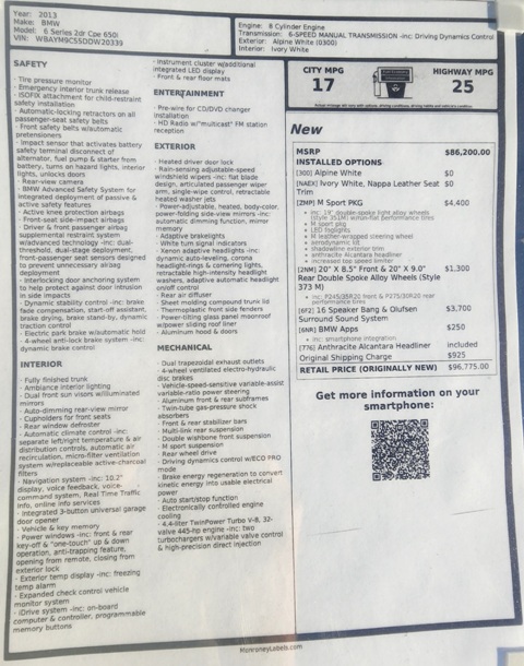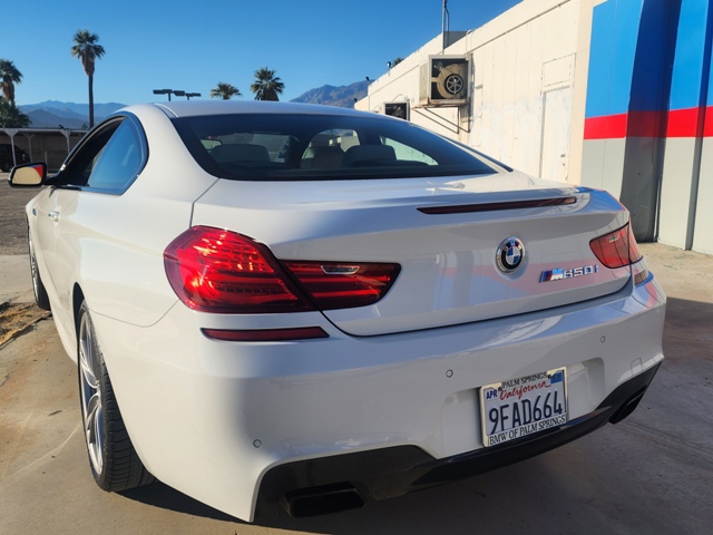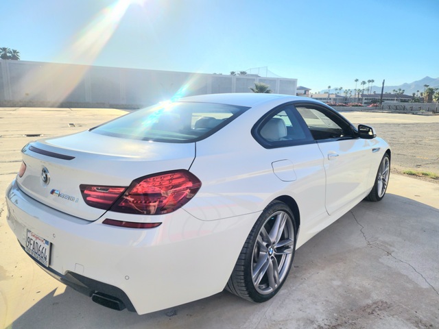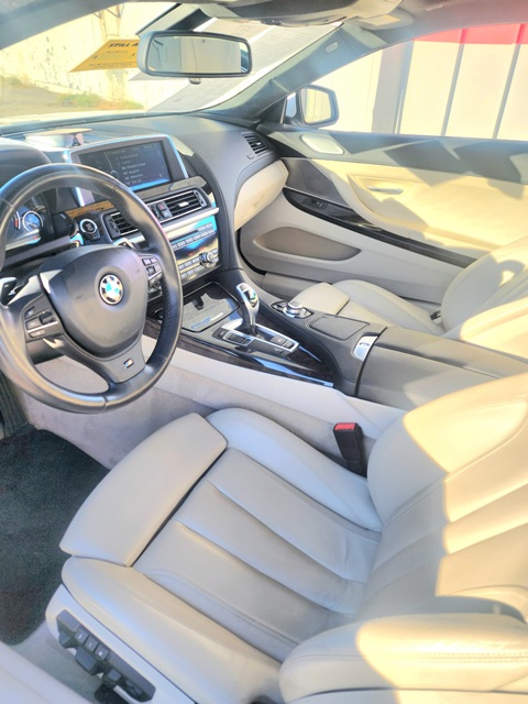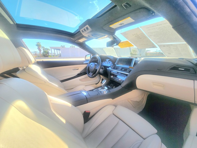 2013 BMW 650I...4.4 liter Twin Turbo V8. 445 hp. 8 speed paddle shift auto trans. Full power features. M Sport Package, with increased top speed limiter. Multi-contour power front sport seats with memory and heated. 16 speaker Bang & Olufsen surround sound system, with bluetooth and XM radio, smartphone integration. Front and rear parking sensors, and backup camera. 20" Double spoke alloy wheels. Sold new at Palm Springs BMW. Excellent dealer service history. Clean CarFax. 66,000 careful miles. Perfect color combo. Original window sticker $96,775. Two key fob remotes. Owners manuals. A lot of car and value at this asking price. Look closely, you won't find a nicer one.