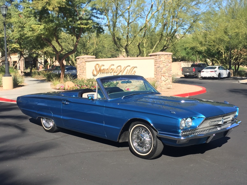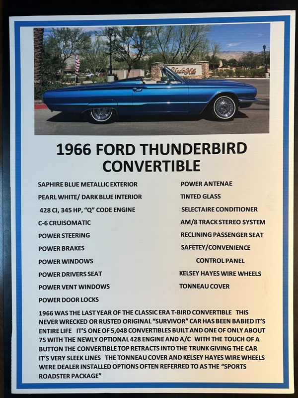 1966 WAS THE LAST YEAR OF THE CLASSIC ERA T-BIRD CONVERTIBLE THIS NEVER WRECKED OR RUSTED ORIGINAL "SURVIVOR" CAR HAS BEEN BABIED IT'S ENTIRE LIFE IT'S ONE OF 5,048 CONVERTIBLES BUILT AND ONE OF ONLY ABOUT 75 WITH THE NEWLY OPTIONAL 428 ENGINE AND A/C WITH THE TOUCH OF A BUTTON THE CONVERTIBLE TOP RETRACTS INTO THE TRUNK GIVING THE CAR IT'S VERY SLEEK LINES THE TONNEAU COVER AND KELSEY HAYES WIRE WHEELS WERE DEALER INSTALLED OPTIONS OFTEN REFERRED TO AS THE "SPORTS ROADSTER PACKAGE". HAS BEEN MECHANICALLY REBUILT AND REPAINTED IN THE ORIGINAL COLOR. SOLD NEW IN LAS VEGAS AND VEHICLE RECORDS INCLUDED FROM 1966 TO PRESENT.