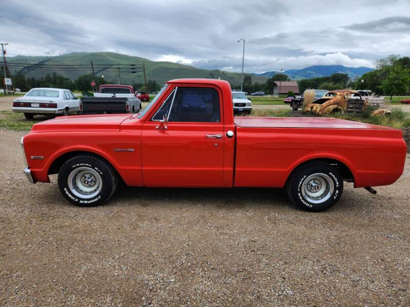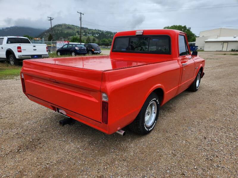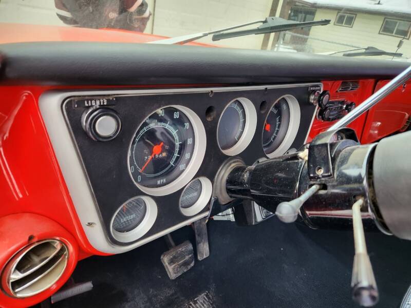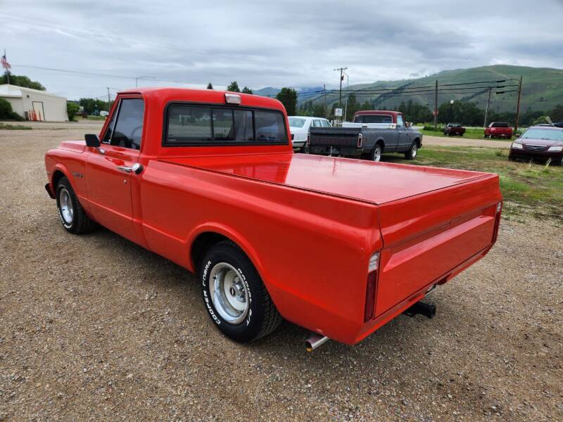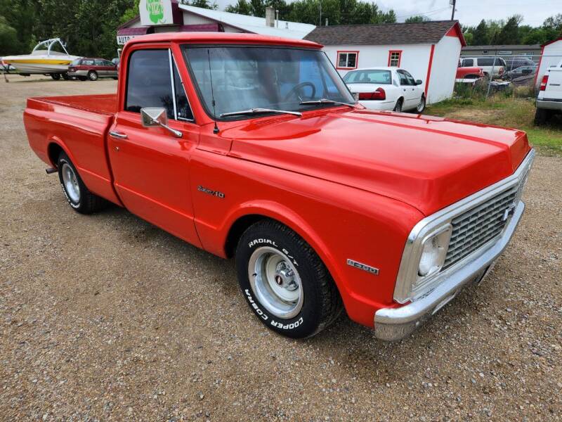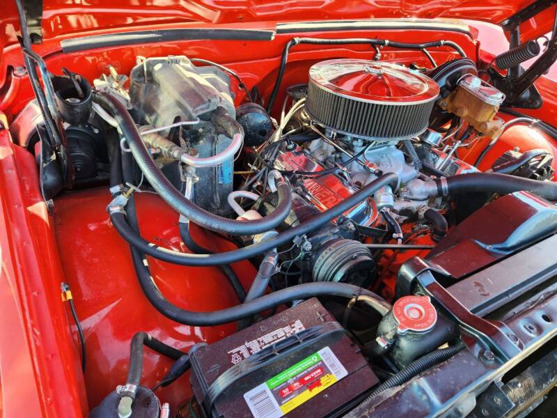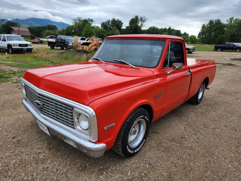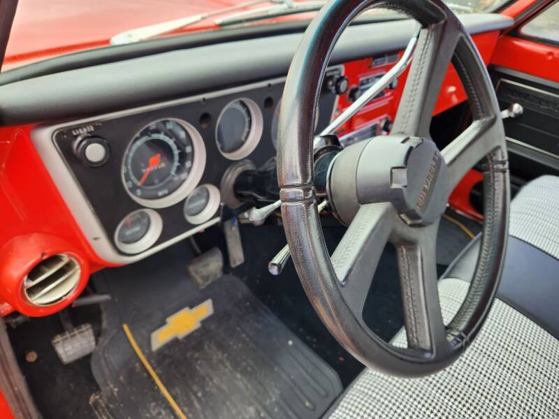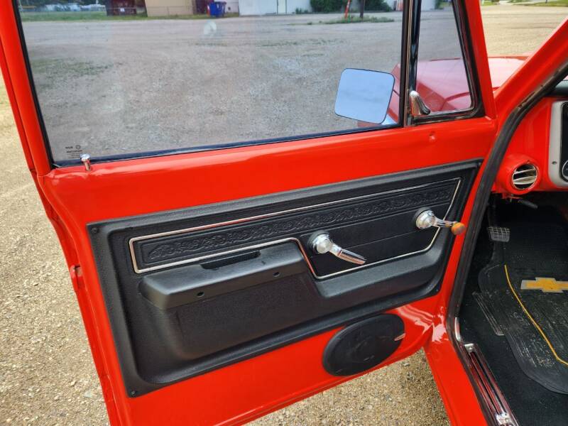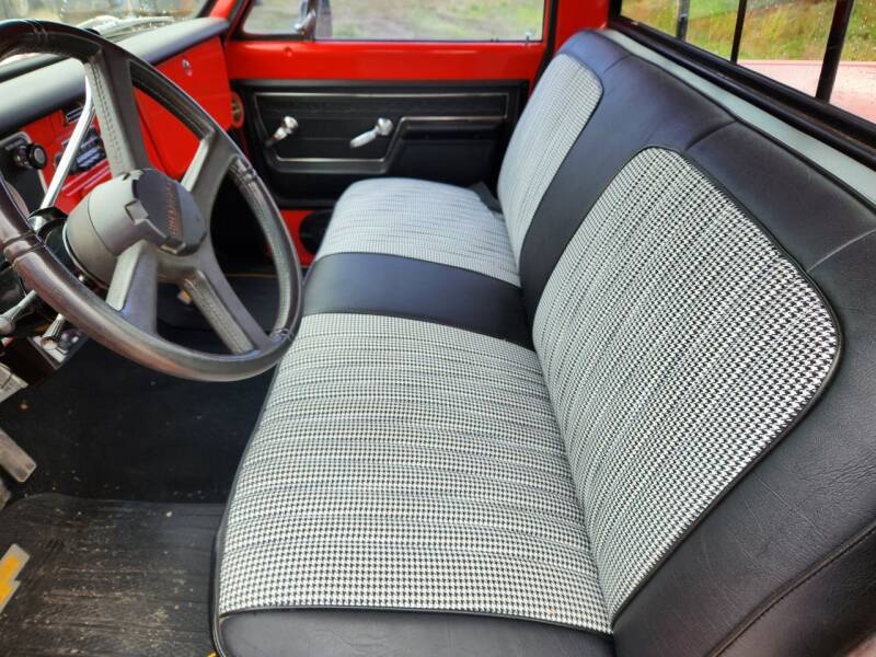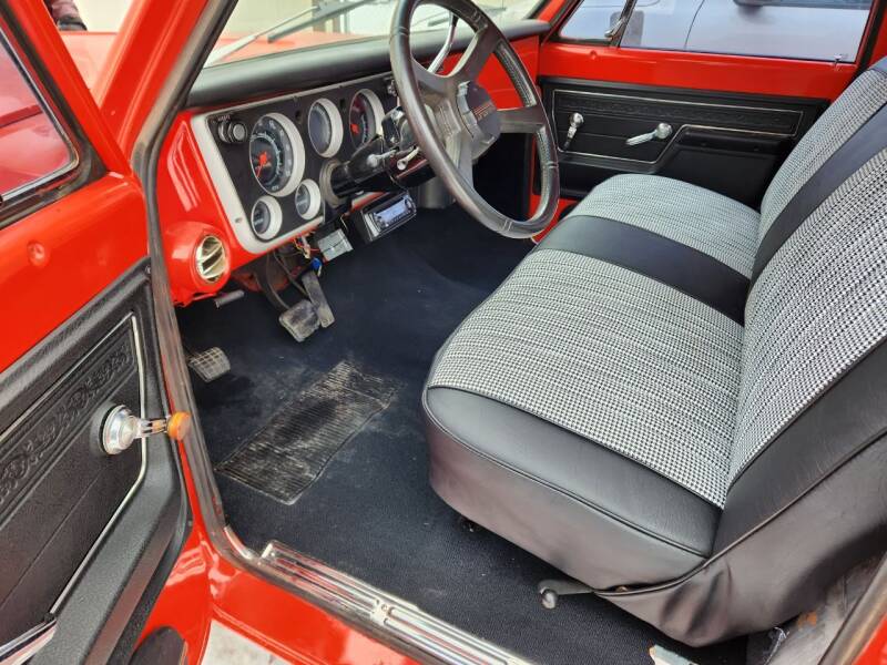 1972 Chevy C/10 RWD , Factory short box - 402 Big block , (Block # T1205TKB) Turbo 400 Transmission , factory A/C blows cold , tilt wheel , factory power steering and power disc brakes . Very solid driver , runs excellent . New houndstooth interior , fresh carpet , new Cooper Cobra tires on factory Rallye wheels . Mild custom body work , "HUGGER ORANGE" paint , entire bed area carpeted and a hard tonneau cover . Just installed new steering gear box and fuel pump . Excellent driver or take it to the next level , the paint is about 12 years old , does have some minor flaws .