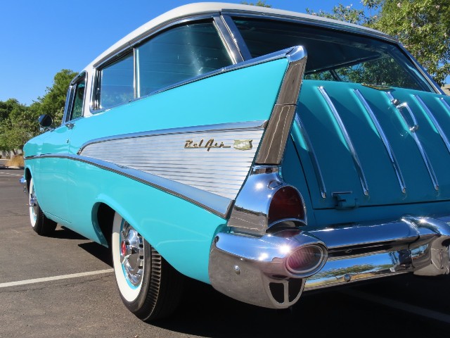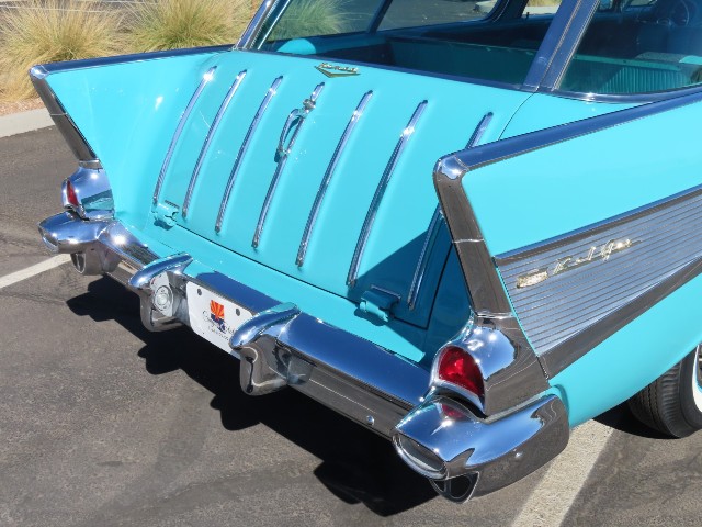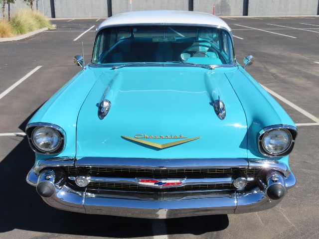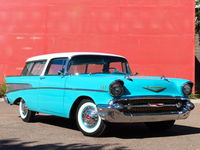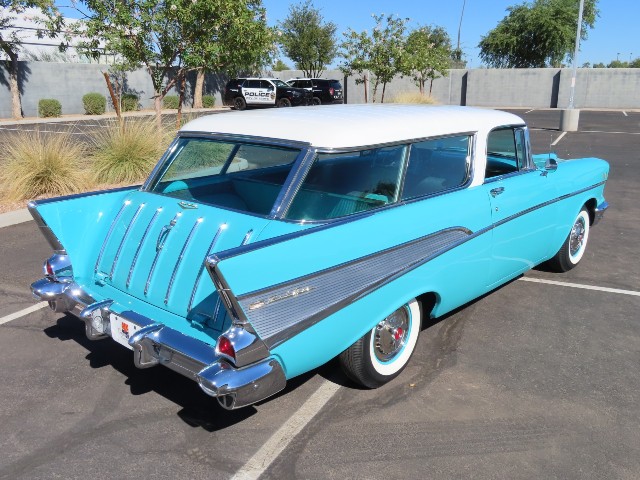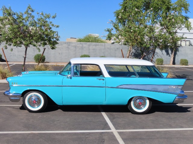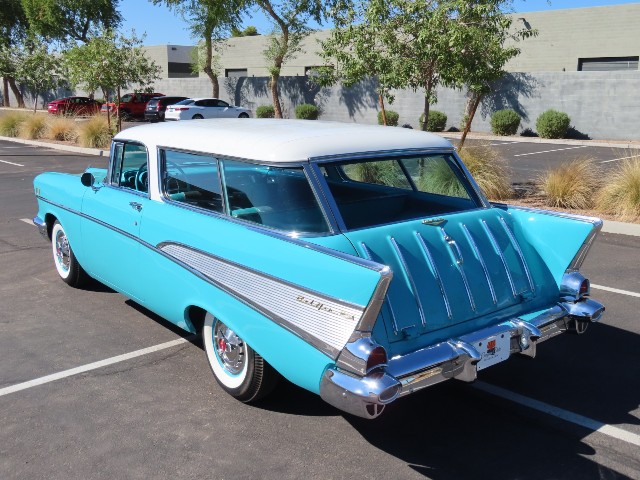 This 1957 Nomad has just undergone a full restoration from the ground up. Underside is just as clean as the top with no rust to be found underneath. This is a true 1957 Bel Air Nomad powered by a small block V8 with dual quad carbs. Vintage AC has been added to keep everyone cool. Finished in the best color combo of Turquoise with a White top and period correct all new interior. Dont miss this one!