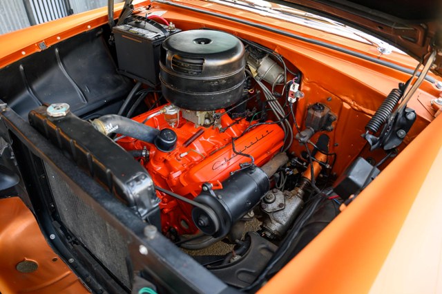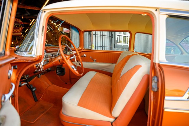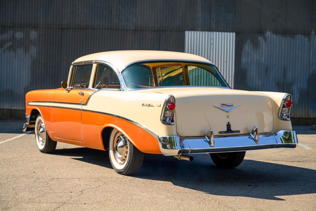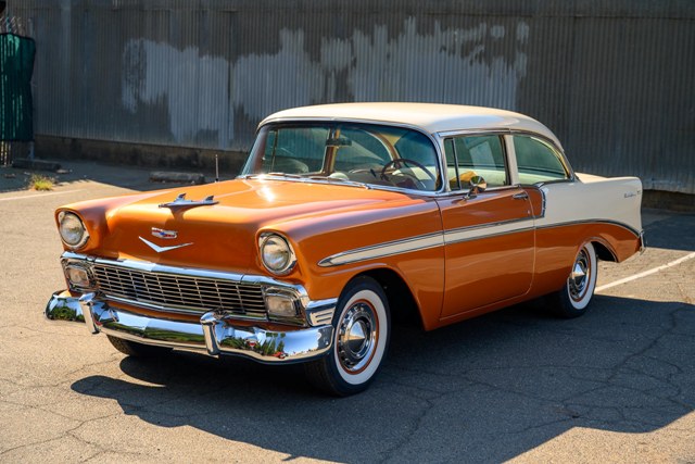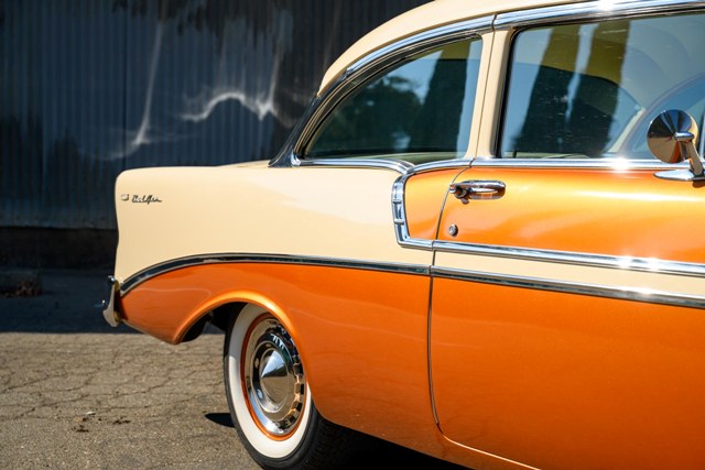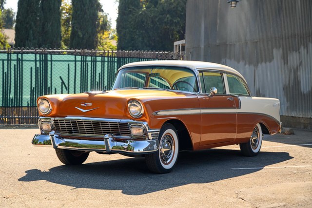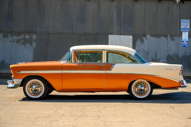1956 Chevy Bel Air 2 Door Sedan - Frame-Off Restoration, Rare Two-Tone Factory Color Sierra Gold/Adobe Beige (Code 700). Original 265ci V8 Engine & 2 Speed Automatic Transmission. All Numbers Matching. Exactly as Trim Tag from Factory, Gorgeous Restored Interior (Code 617), Custom Floor Mats, Factory Tinted Glass, All New Bushings Body & Front End, New Fuel Tank, New Wide White Wall Radial Tires, Beautiful Classic Chevy Time Capsule!