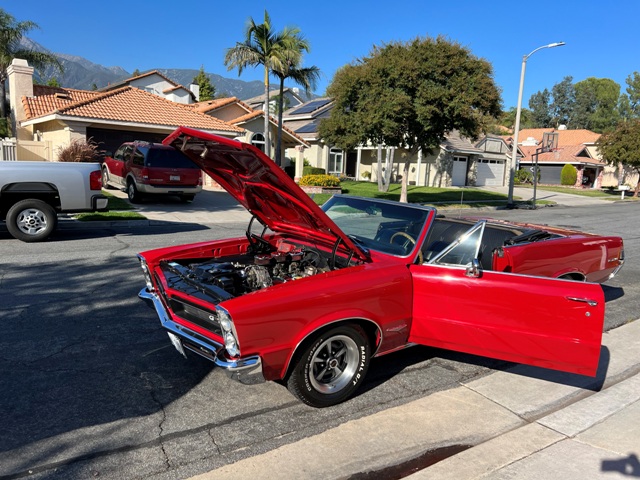 This 65 GTO convertible is a “Tribute” GTO. Born as a 65 Le Mans and converted to a GTO prior to my purchase. It has a 389 Motor with Tri power carbs. It is auto. The convertible is automatic also. This is an amazing looking car and will turn heads everywhere. I have owned this car since 2017 and it is Awesome. It is by no means perfect 10 or a show car. But runs and drives great and looks amazing. It’s fun to cruise around and it is very quick. This car has lots of power. *Retro fit A\C *Sound system and Alarm *Installed front disc brakes. *Rebuilt carbs. *Installed headers and wrapped the exhaust. *Pulled motor and refreshed (new paint on motor) *Installed new starter and ignition.