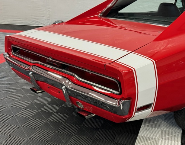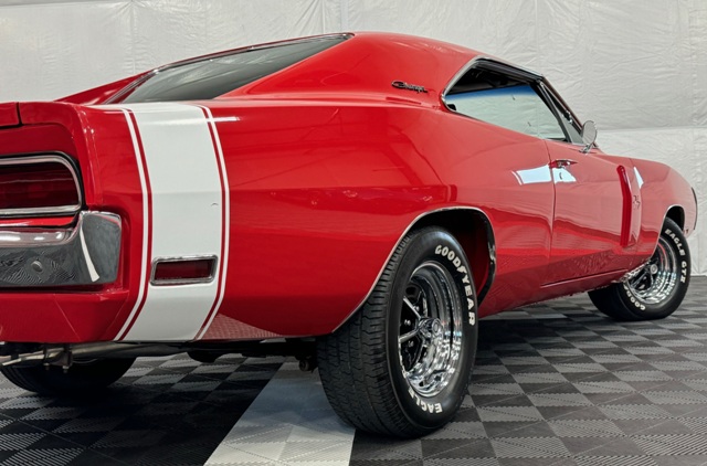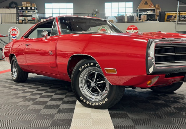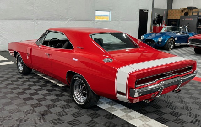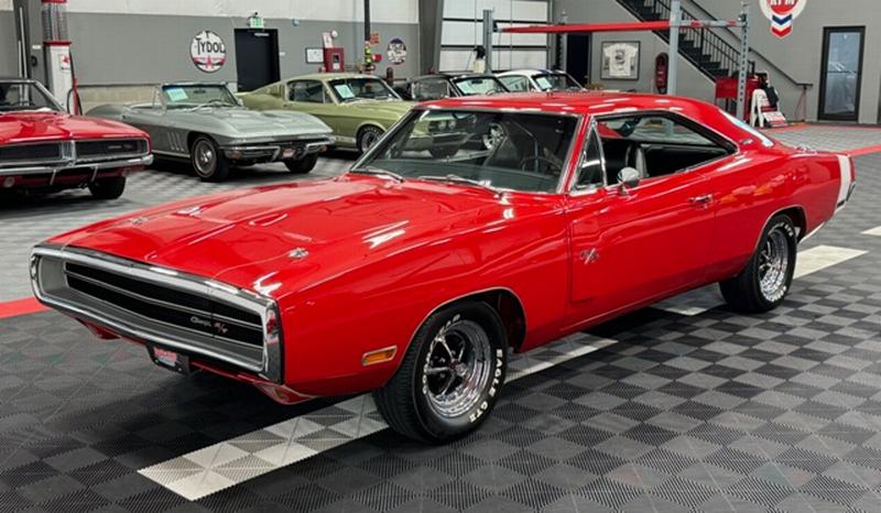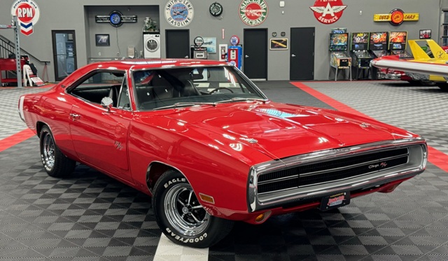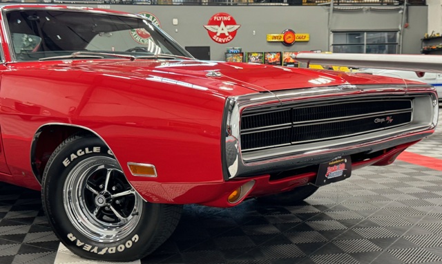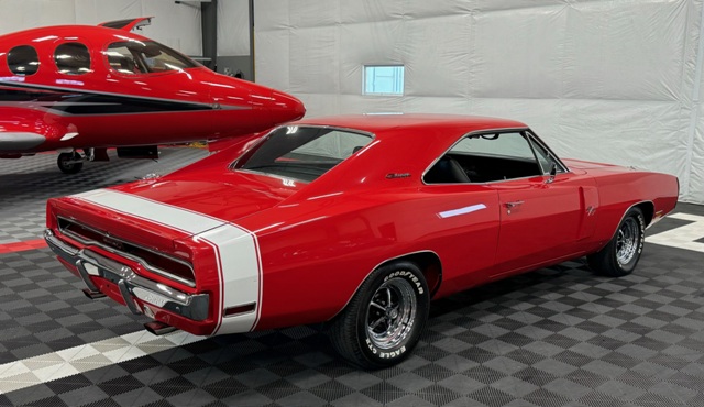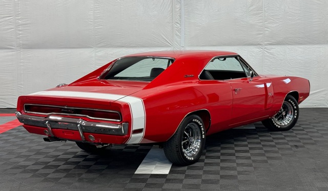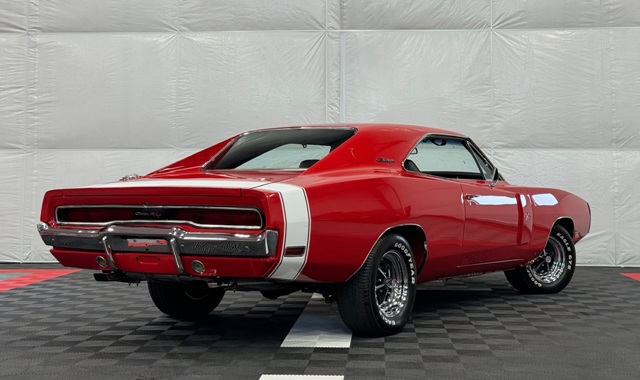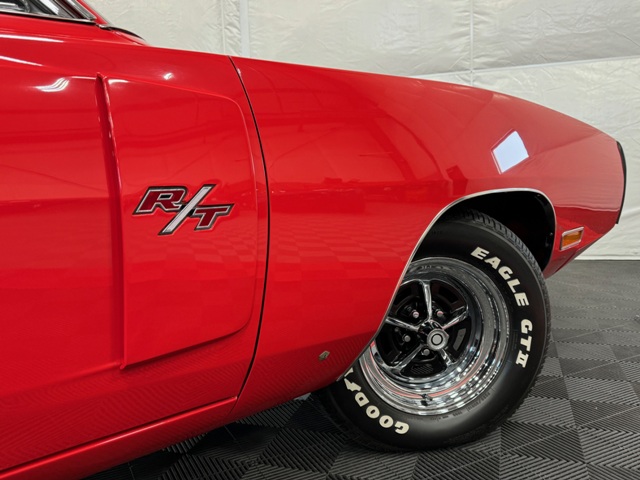 1970 Dodge Charger R/T Factory V Code 440 6 Pack V8 original build sheet Matching Numbers Finished in FE5 Red Exterior Three Year Rotisserie Restoration Underside Is Painted FE5 Red To Show Quality one of only 337 Chargers built with the 440+6 and automatic transmission Hideaway Headlights hood mounted turn signals indicator lights and hood pins it is powered by a 440 cubic inch V8 with three 2 barrel carburetors. dual exhaust with ‘H’ pipe and factory chrome tips. Power brakes. The engine is paired with a Torqueflite A727 automatic transmission and 4.10 ratio Dana 60 rear end. 15 inch chrome Magnum 500 wheels The interior features black vinyl bucket front seats and rear seat. Coordinating black door panels, headliner, rear package tray and dash. Center console with floor shifter and woodgrain coordinating with the dash. Full factory gauges including tachometer, clock, 3 speed wipers and heater/defroster. This car is radio delete.