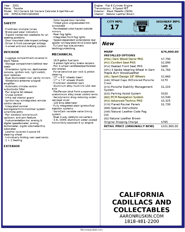 2001 Porsche Carrera cabriolet, a very loaded example w a 6 speed, Metallic black, tan supple leather, full burlwood interior including steering wheel, Nav, heated seats, factory hard top, 18 factory wheels, MSRP 102, Recent service, car runs outstanding w no issues.